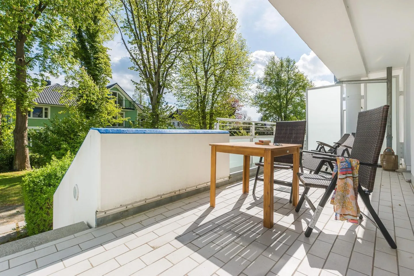 Vom Wohnzimmer aus hat man direkten Zugang zur großen möblierten Terrasse und kann hier wunderschöne Sommerabende verbringen.