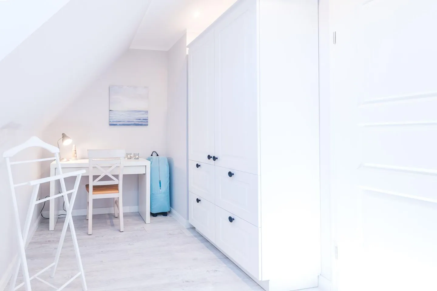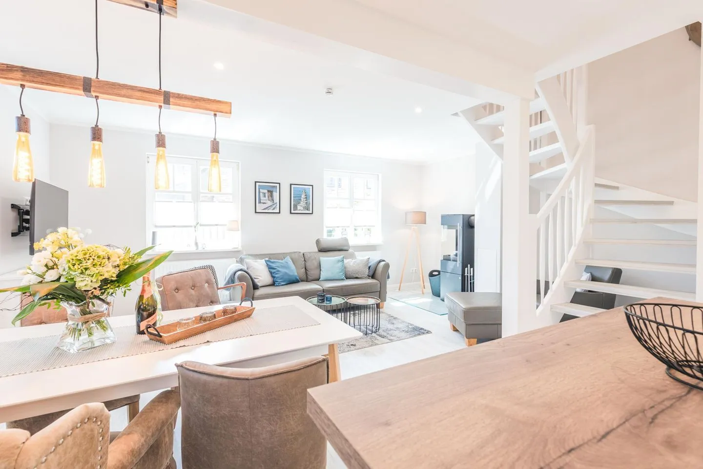 Über eine breite komfortable Treppe erreichen Sie die obere Etage mit zwei behaglichen Schlafzimmern. Das größere von beiden ist mit einem komfortablen Doppelbett, einem großzügigen Kleiderschrank sowie einen schwenkbaren Smart-TV ausgestattet. Das zweite Schlafzimmer besticht mit seinem maritimen Flair. Ein großes Dachfenster lässt viel Licht in den Raum mit zwei Einzelbetten, einem Kleiderschrank, einem kleinem Sekretär und einem weiteren schwenkbaren Smart- TV.