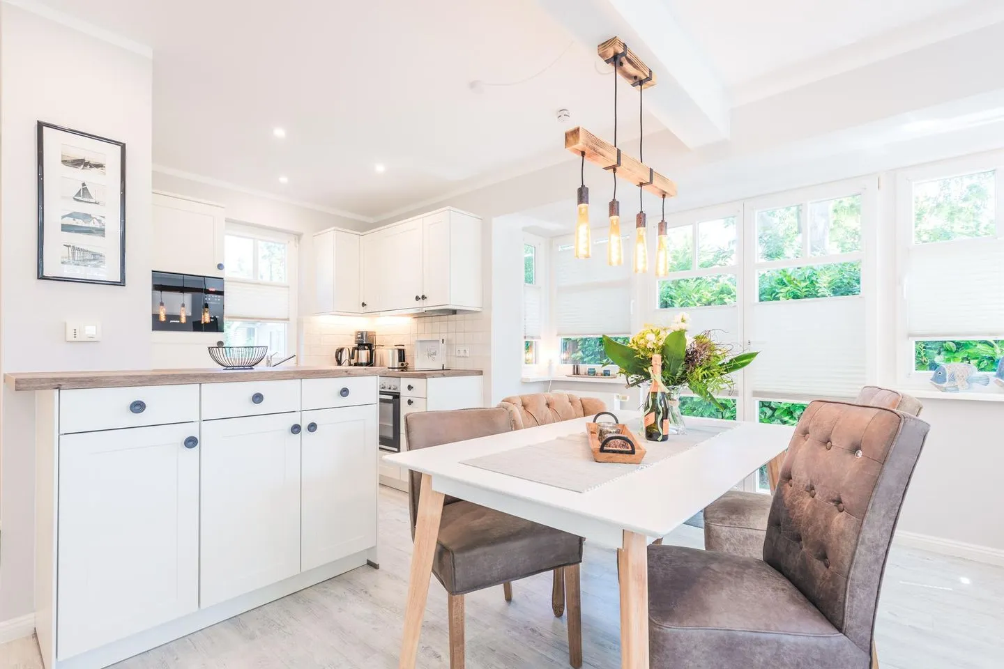 Im Erdgeschoß betreten Sie durch einen Flur mit Garderobe den offenen und großzügigen Wohn- /Eßbereich mit moderner Einbauküche. Eine umfassende Ausstattung bietet alles, was Sie für einen angenehmen Aufenthalt benötigen.