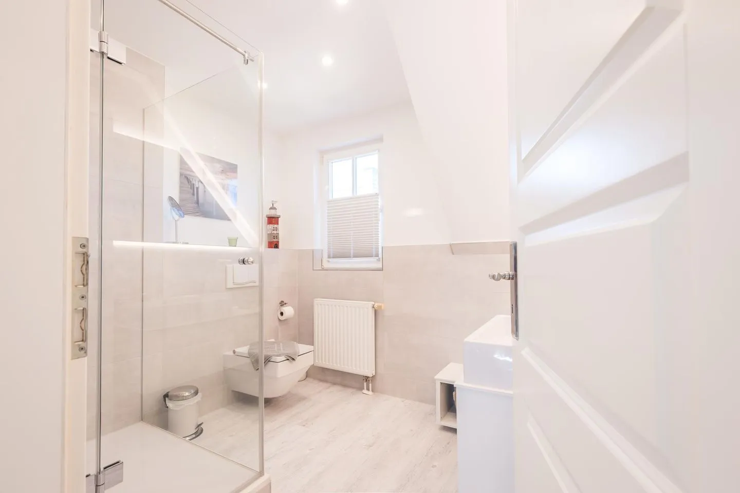 Das moderne, großzügige Badezimmer in der oberen Etage ist geschmackvoll und mit Markenfabrikaten eingerichtet. Entspannen Sie nach einem Spaziergang, Strandlauf oder Bad in der Ostsee in der großzügigen Dusche und genießen Sie die vom Handtuchheizkörper vorgewärmten Handtücher.