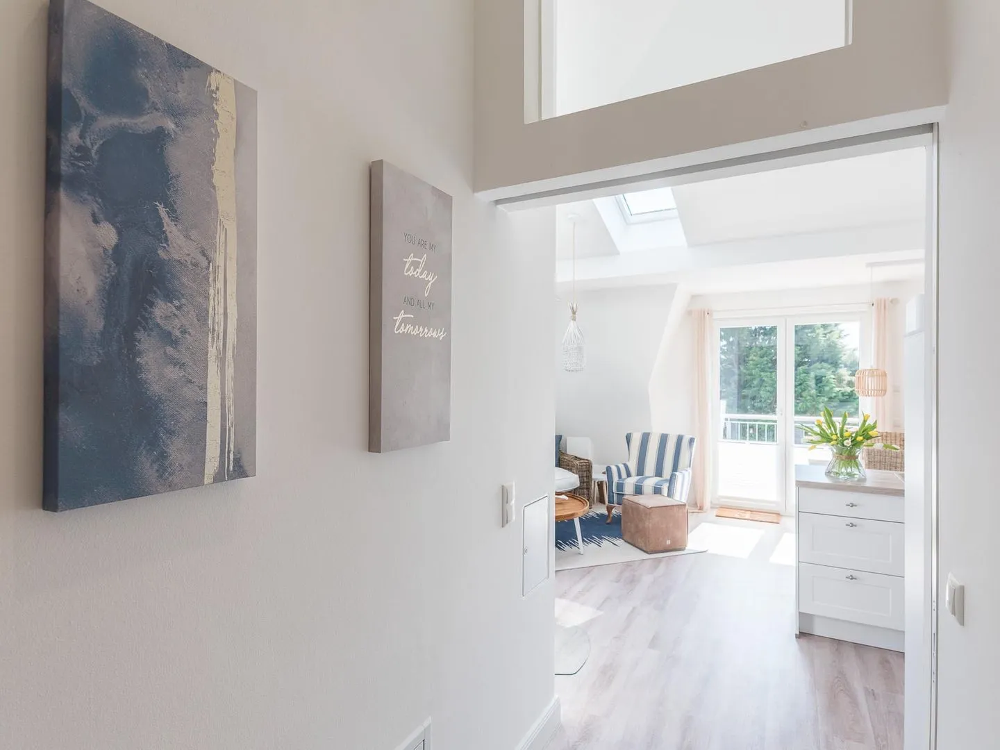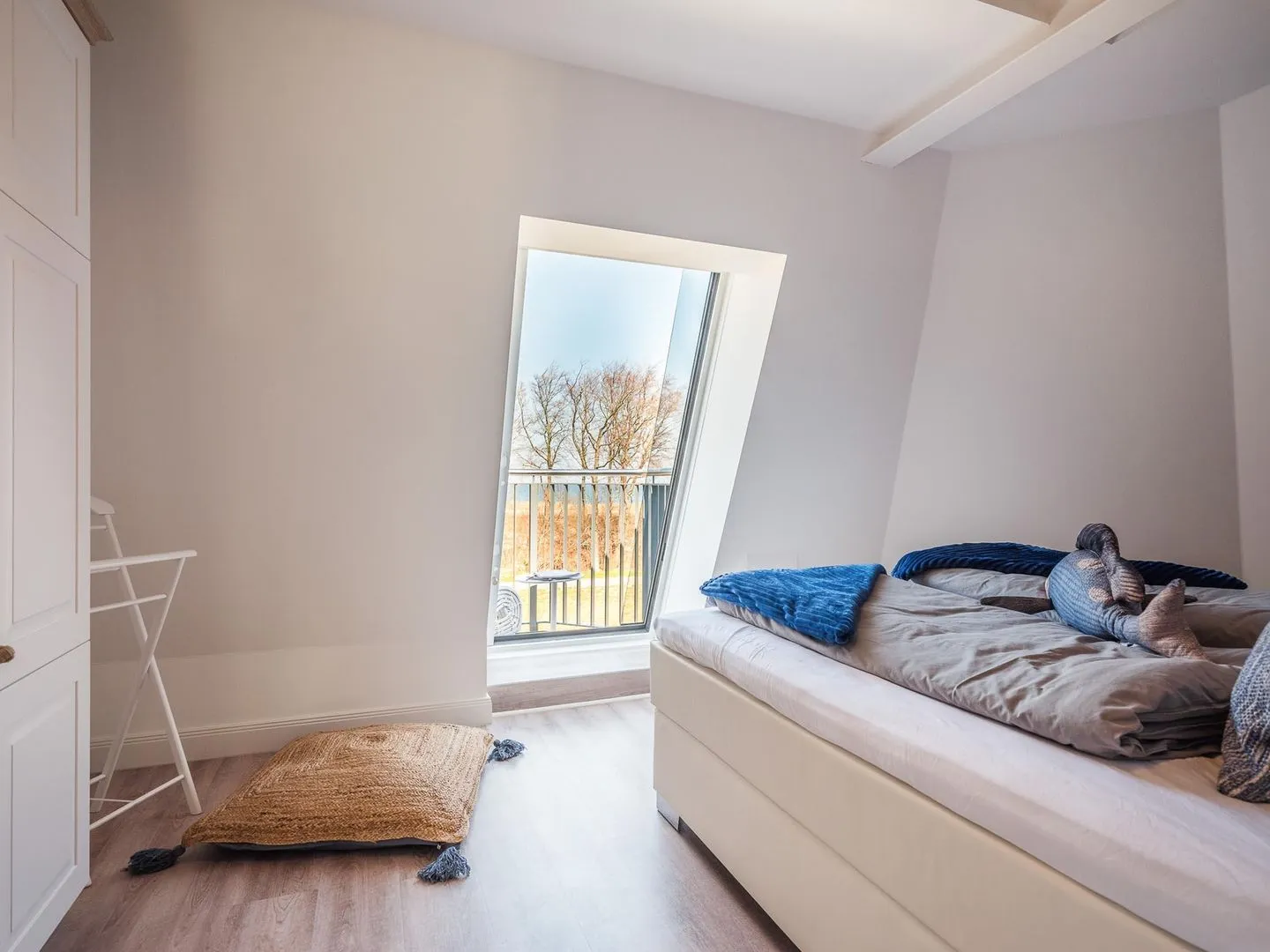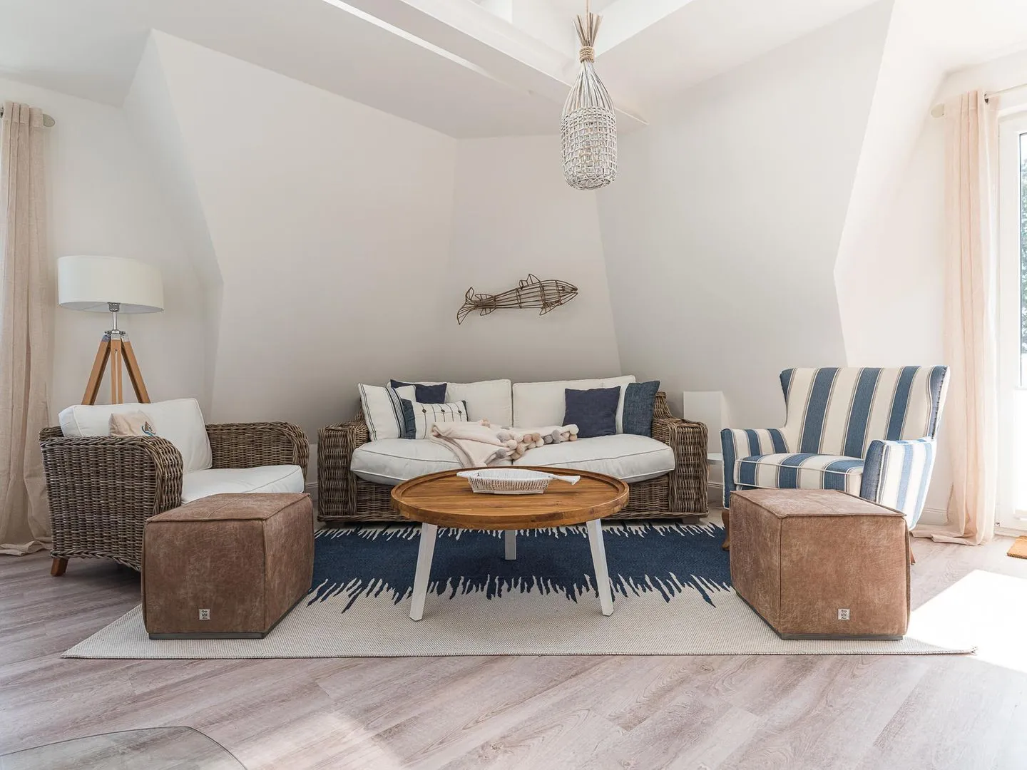 Die bodentiefen Fenster lassen den maritimen und zugleich eleganten Charme des lichtdurchfluteten Penthouses besonders zur Geltung kommen.