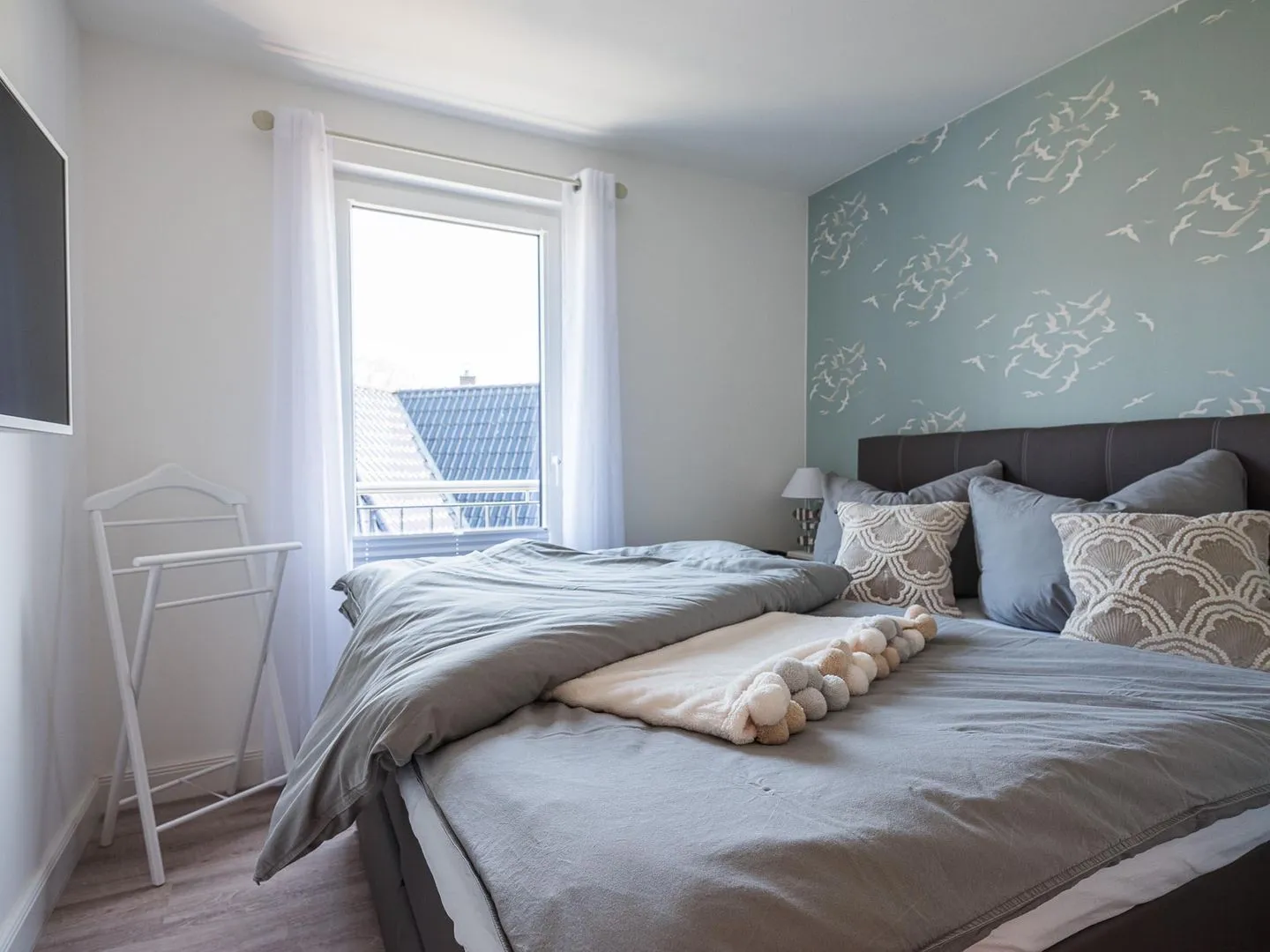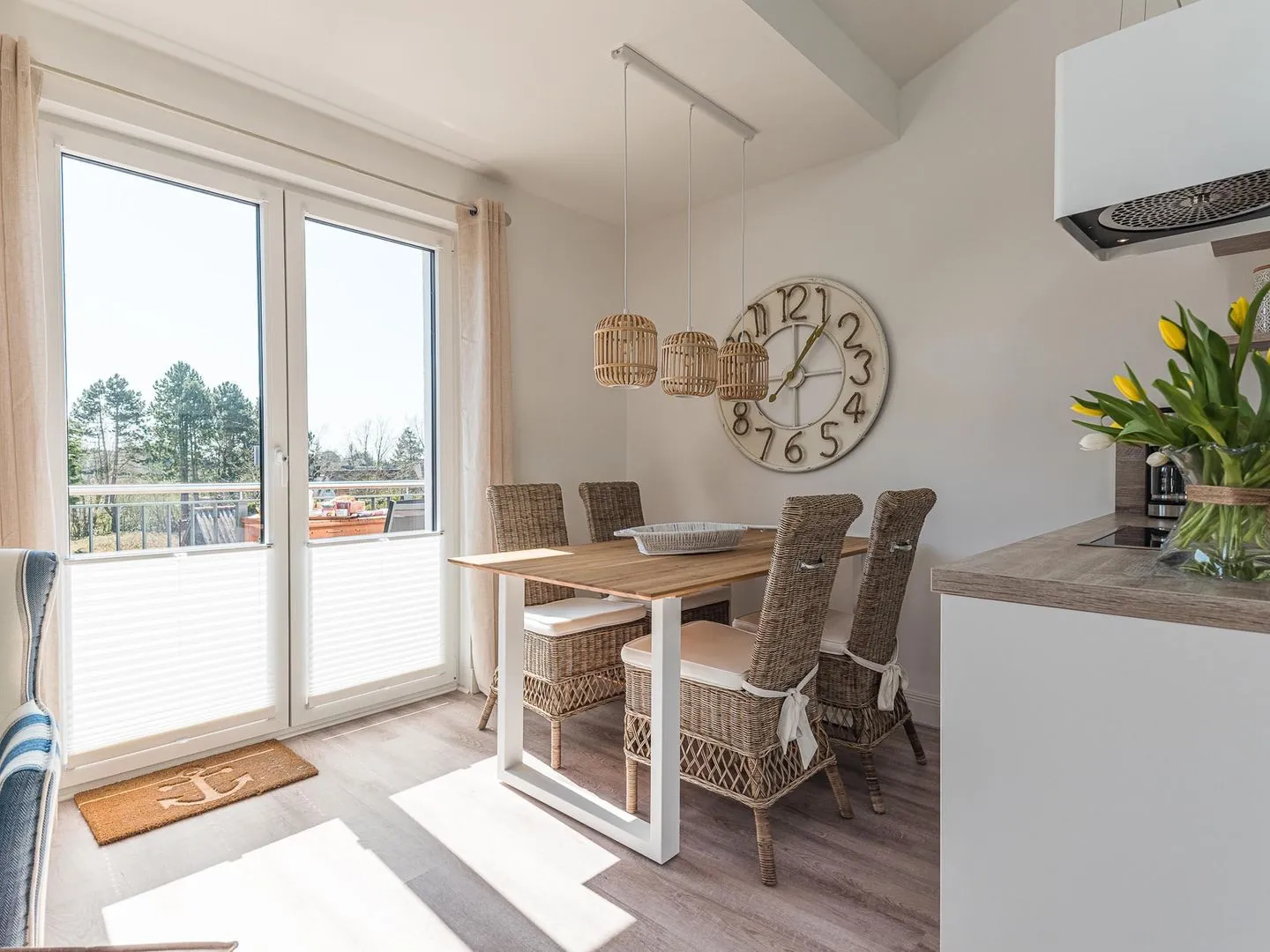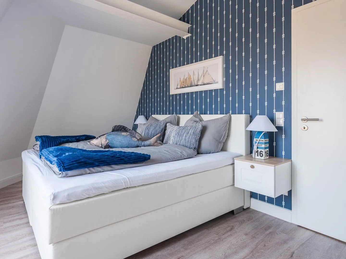 Die bodentiefen Fenster lassen den maritimen und zugleich eleganten Charme des lichtdurchfluteten Penthouses besonders zur Geltung kommen.
