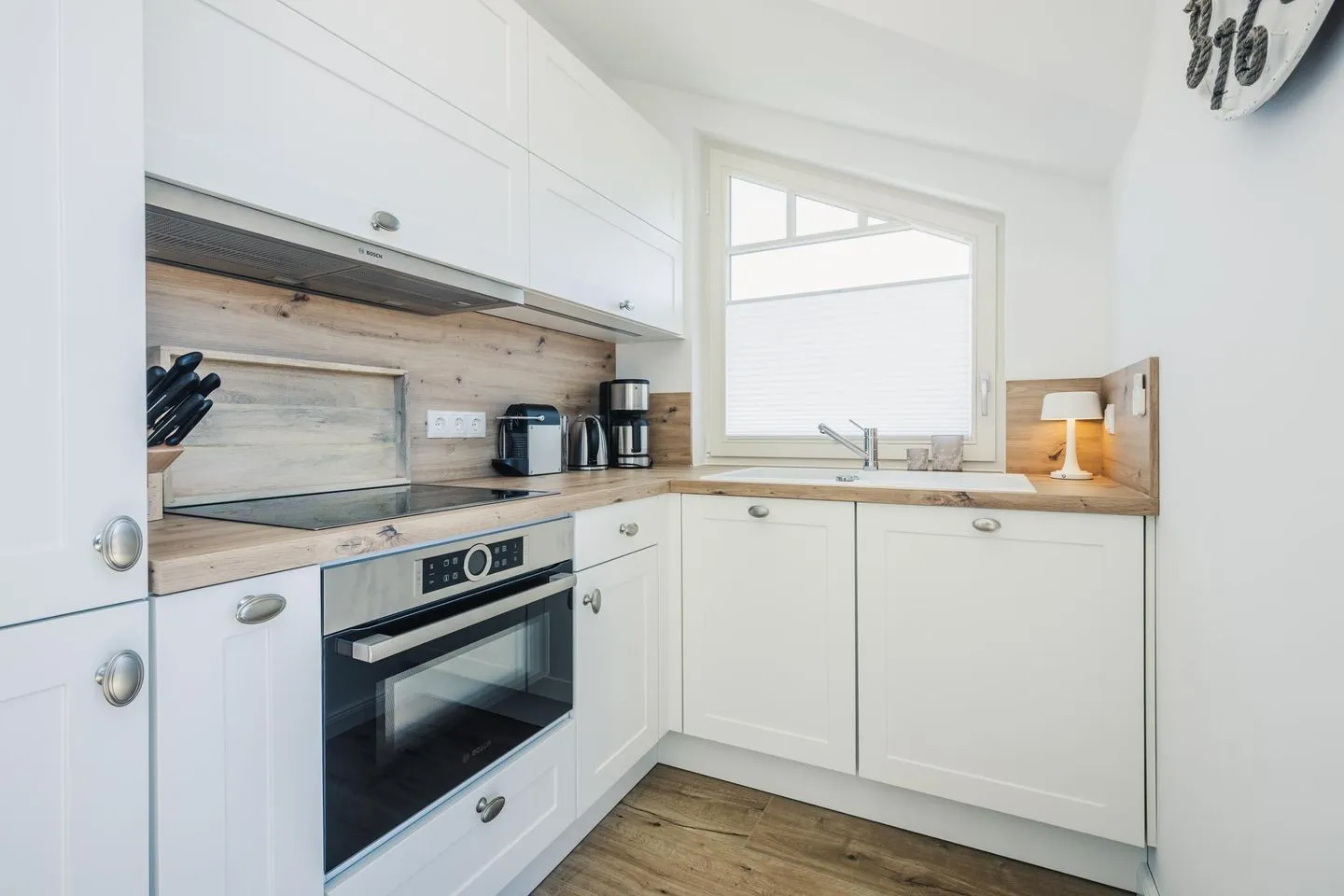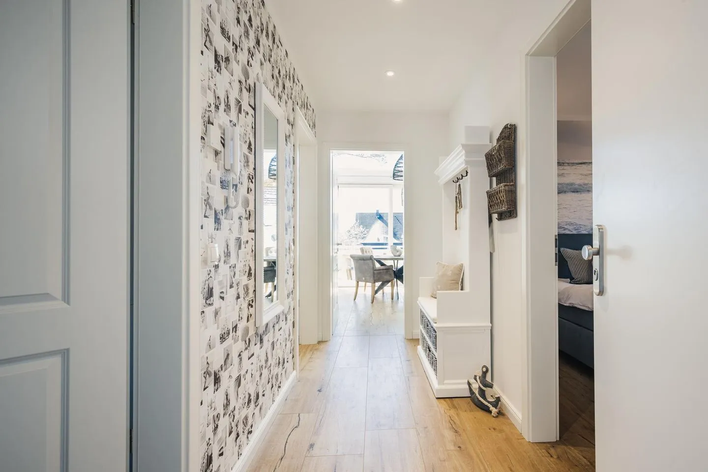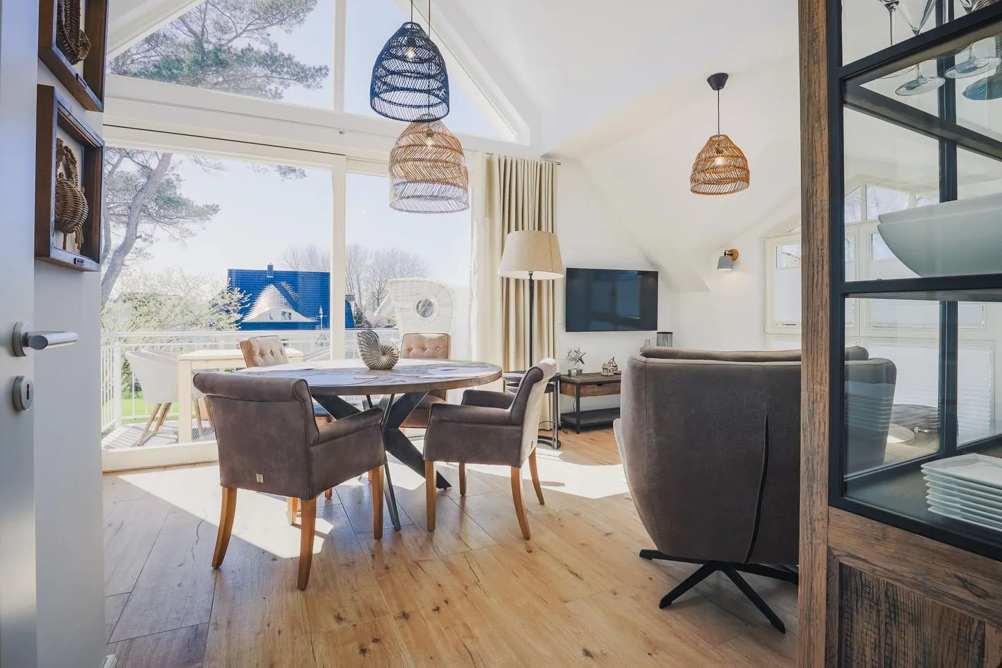 Die Wohnung ist sehr hell und hochwertig eingerichtet und besticht durch viel Liebe zum Detail und zum Meer. Das Herzstück der „MeerLiebe“ ist der große und gemütliche Wohn-/ Essbereich mit offen gestalteter Küche mit einer Raumhöhe von bis zu 5 Metern.