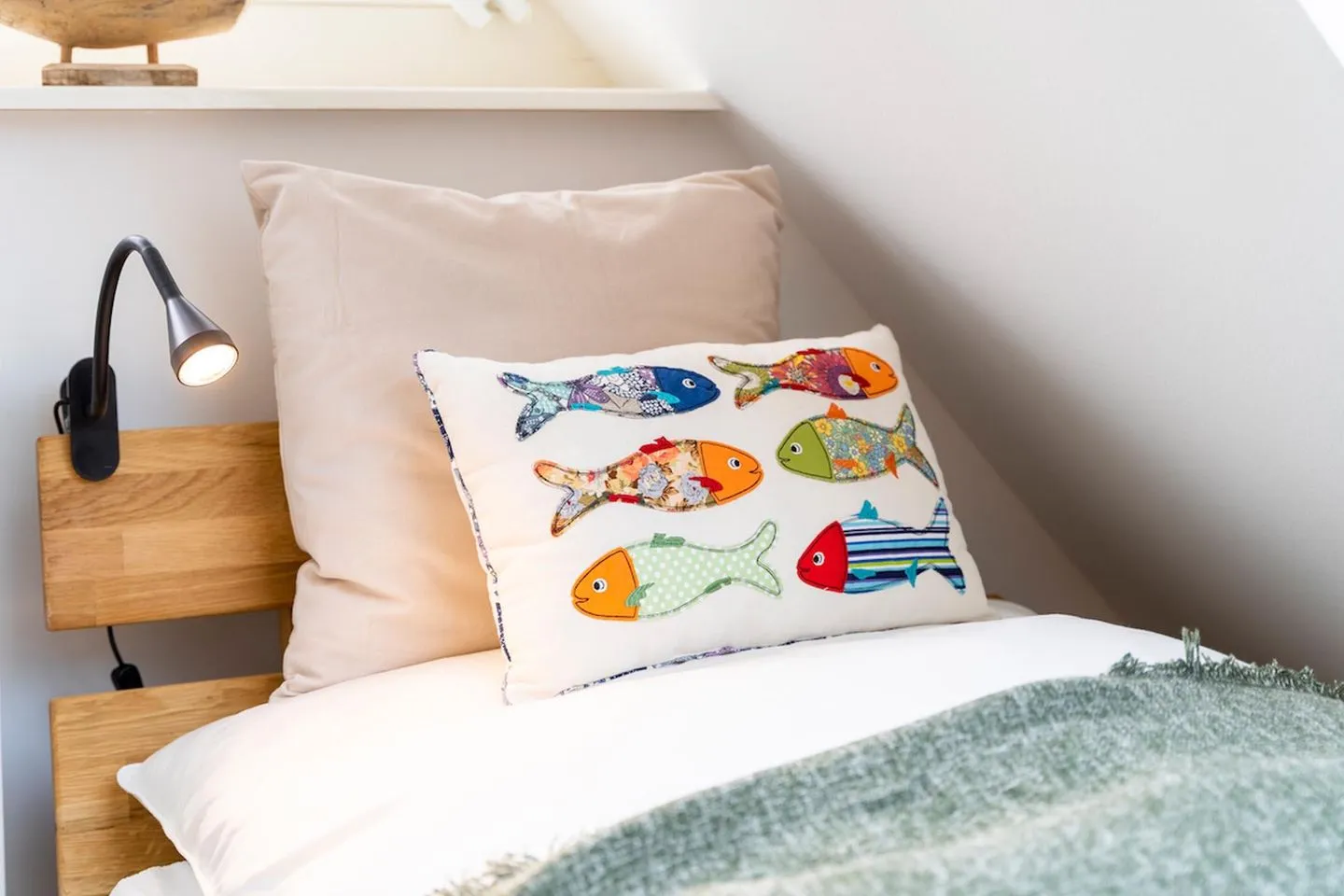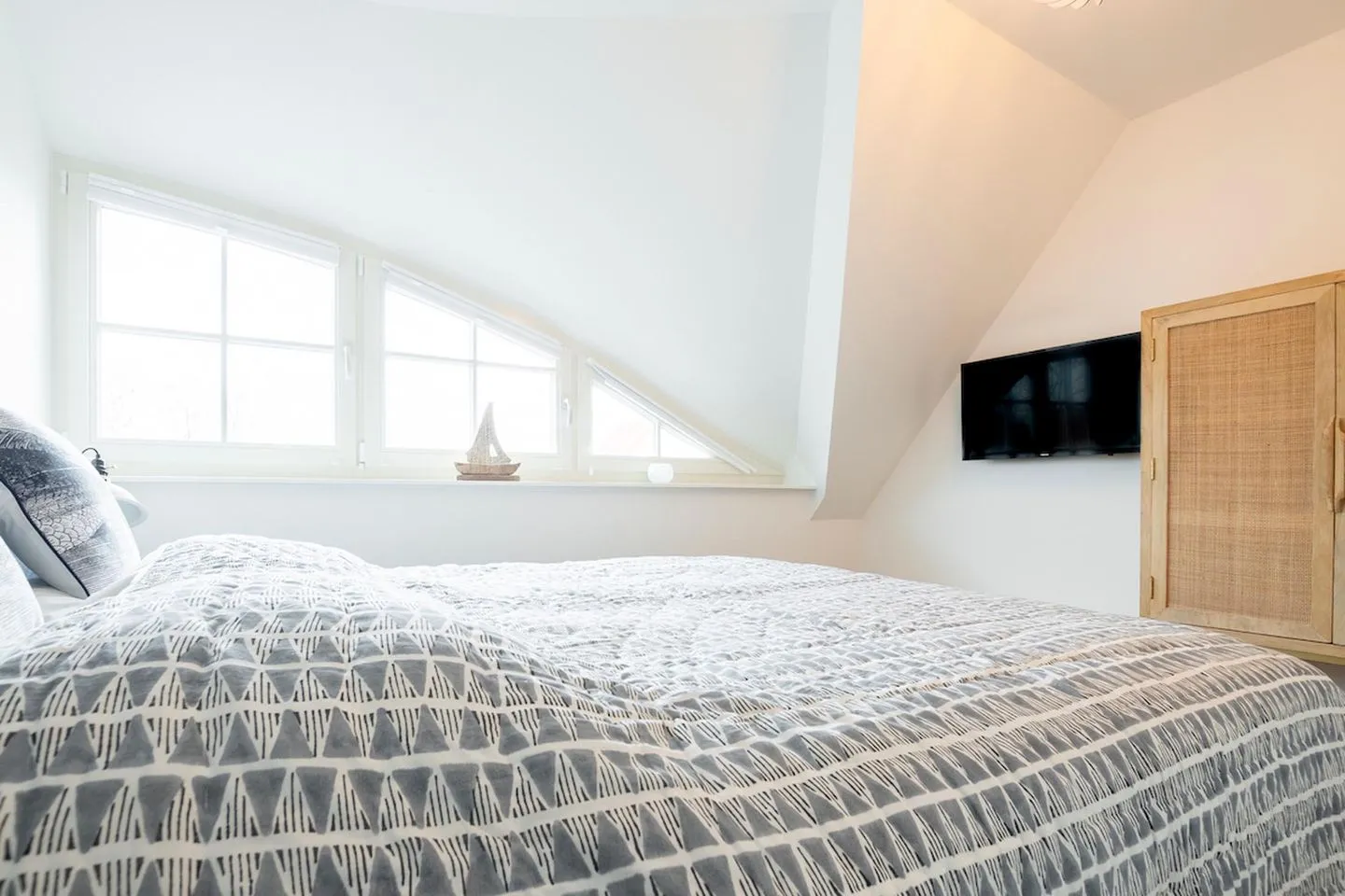 Im Obergeschoss des Ferienhauses befinden sich zwei Schlafzimmer für je zwei Personen. Eines der Hauptschlafzimmer hat Zugang zu einem separaten kleinen Zimmer mit Einzelbett. Die Schlafzimmer sind mit Boxspringbetten ausgestattet. Der ausgebaute Spitzboden verfügt über zwei weitere Einzelbetten. Drei von vier Schlafzimmern verfügen über einen Flatscreen-TV.