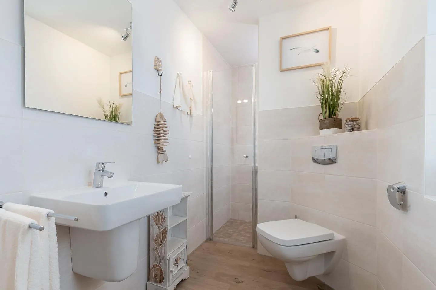 Ebenfalls auf dieser Ebene befindet sich das voll ausgestattete Badezimmer mit großer finnischer Sauna, bodengleicher Dusche und Badewanne.