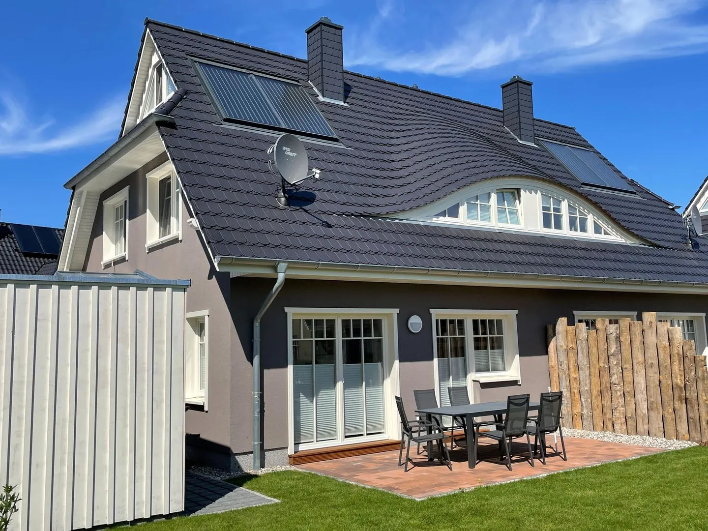 Betreten Sie das Haus durch den Flur, von dem aus Sie zunächst das Gäste-WC mit bodengleicher Dusche und dann den großzügigen Küchen-, Ess- und Wohnbereich erreichen. Die Küche ist voll ausgestattet und lässt das Herz eines jeden Hobbykochs höherschlagen. Für die Familie bietet der große Esstisch oder die Sofalandschaft vor Flatscreen-TV und Kamin viel Platz zum Wohlfühlen. Auch von der südwestlich ausgerichteten Terrasse genießen Sie gemütliche Abende.