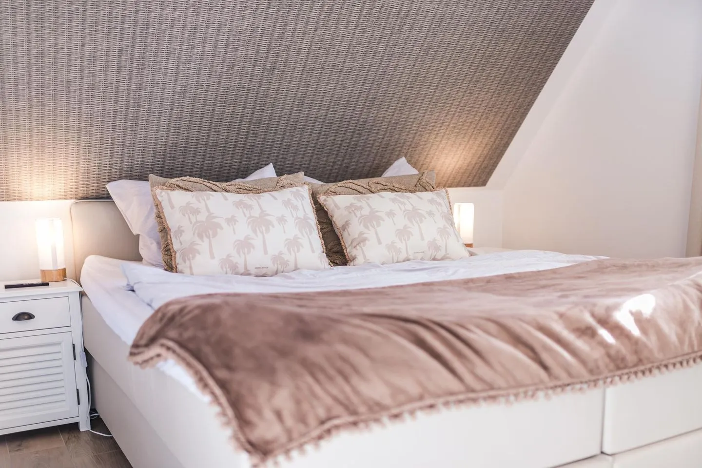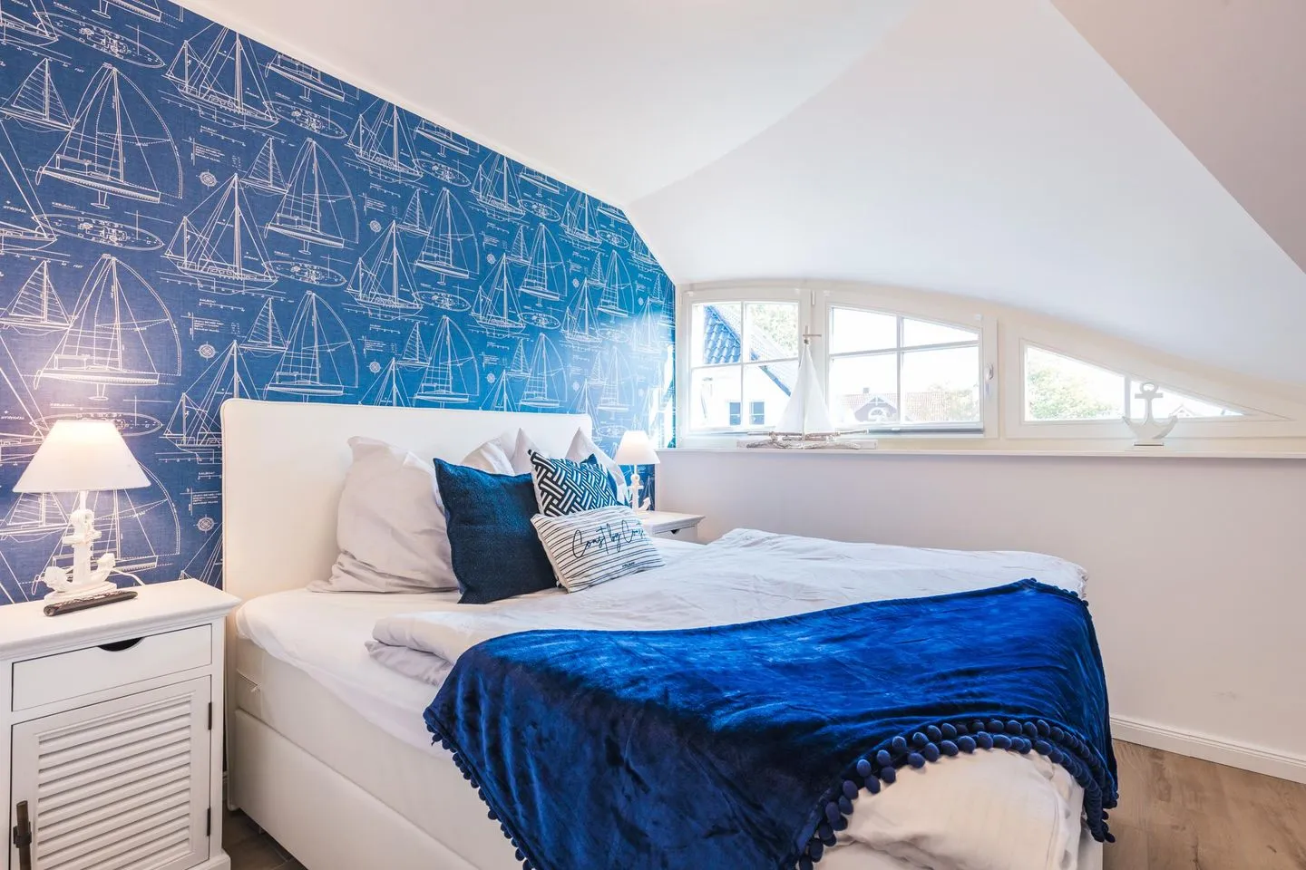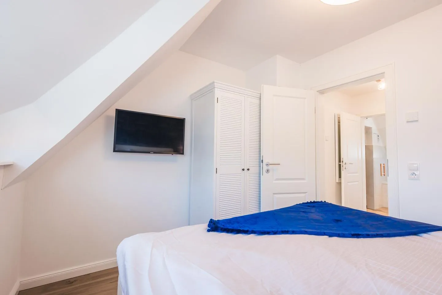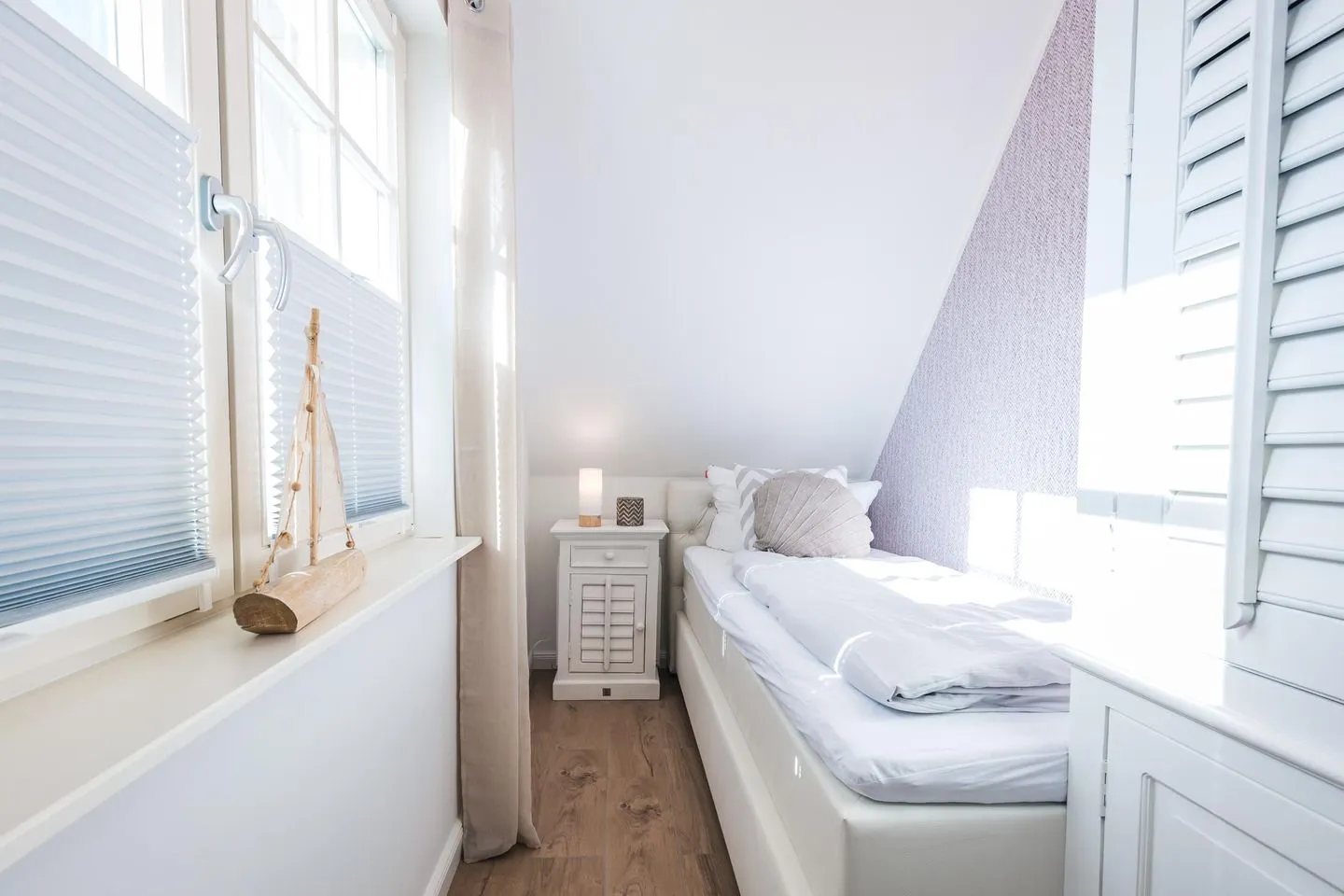 Im Obergeschoss des Ferienhauses befinden sich zwei Schlafzimmer für je zwei Personen, eines der Hauptschlafzimmer hat Zugang zu einem separaten weiteren kleinen Zimmer mit Einzelbett. Die Schlafzimmer sind mit Boxspringbetten ausgestattet. Der ausgebaute Spitzboden verfügt über zwei weitere Einzelbetten. 3 von 4 Schlafzimmern verfügen über einen Flatscreen TV.