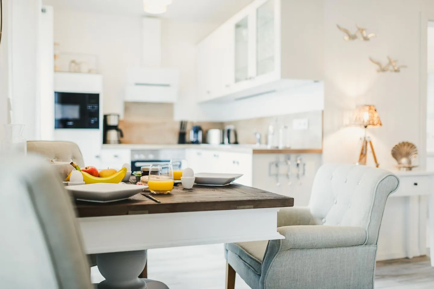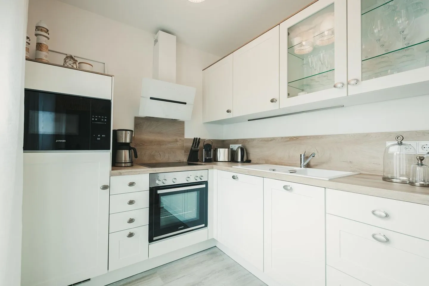 Über einen geräumigen Eingangsbereich mit Garderobenschrank, gelangen Sie in das gemütliche Wohnzimmer mit offener Küche und einem  großzügigen Essplatz. Die Küche ist exklusiv und besticht durch eine breit gefächerte Ausstattung. Neben den Standard Küchenmaschinen steht für Sie auch eine Nespresso-Kapselmaschine bereit.