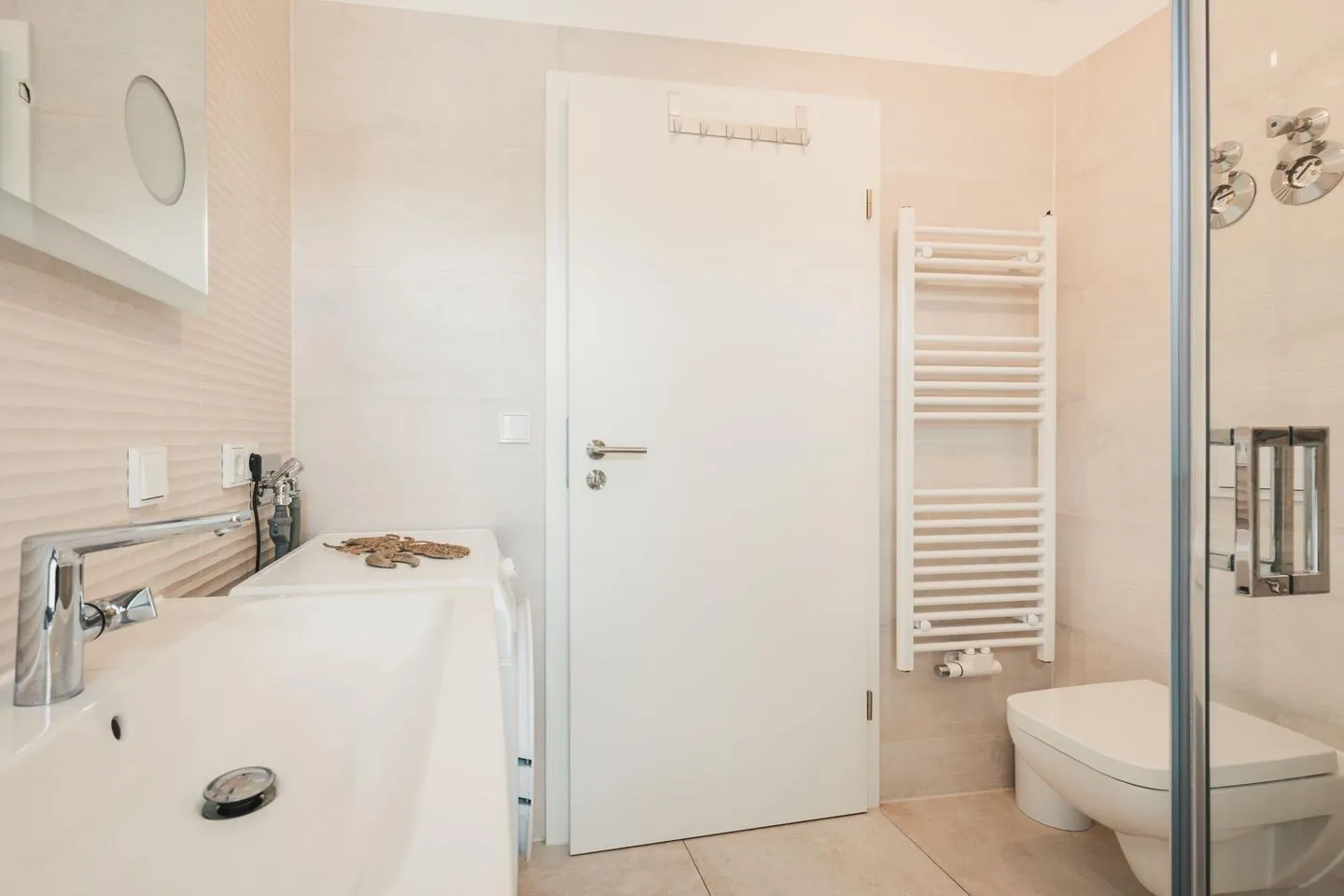 Das Badezimmer ist in modernen Naturtönen gehalten und verfügt über eine ebenerdige Dusche, ein WC, sowie eine Waschmaschine.