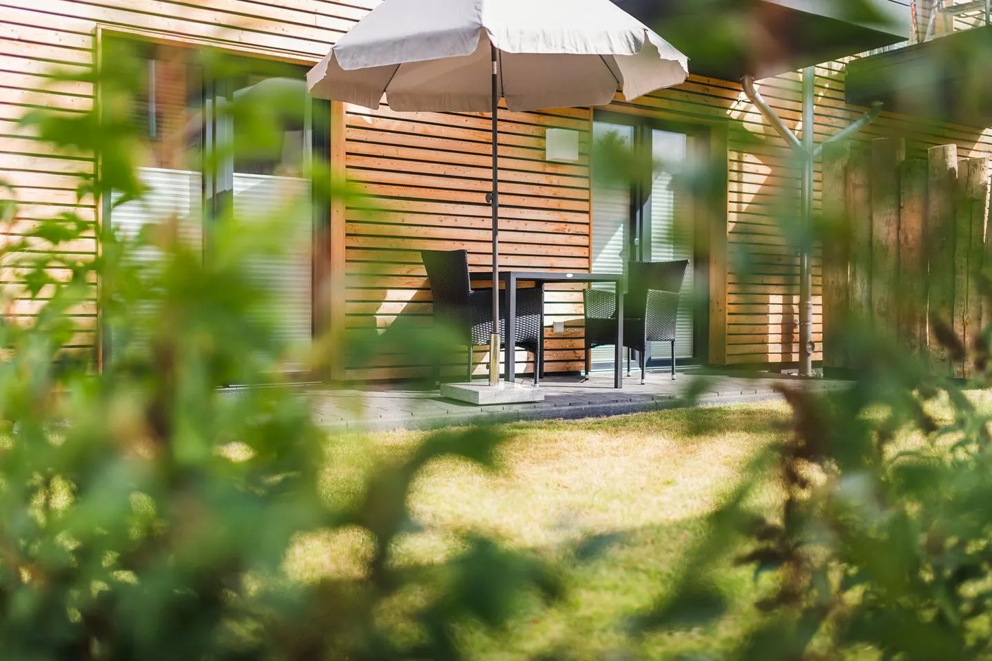 Sowohl vom Wohn- als auch vom Küchenbereich gelangen Sie über große Balkontüren auf die möblierte Terrasse mit angrenzendem Garten. Hier finden Sie viel Platz zum privaten Sonnenbaden, Essen und Erholen.