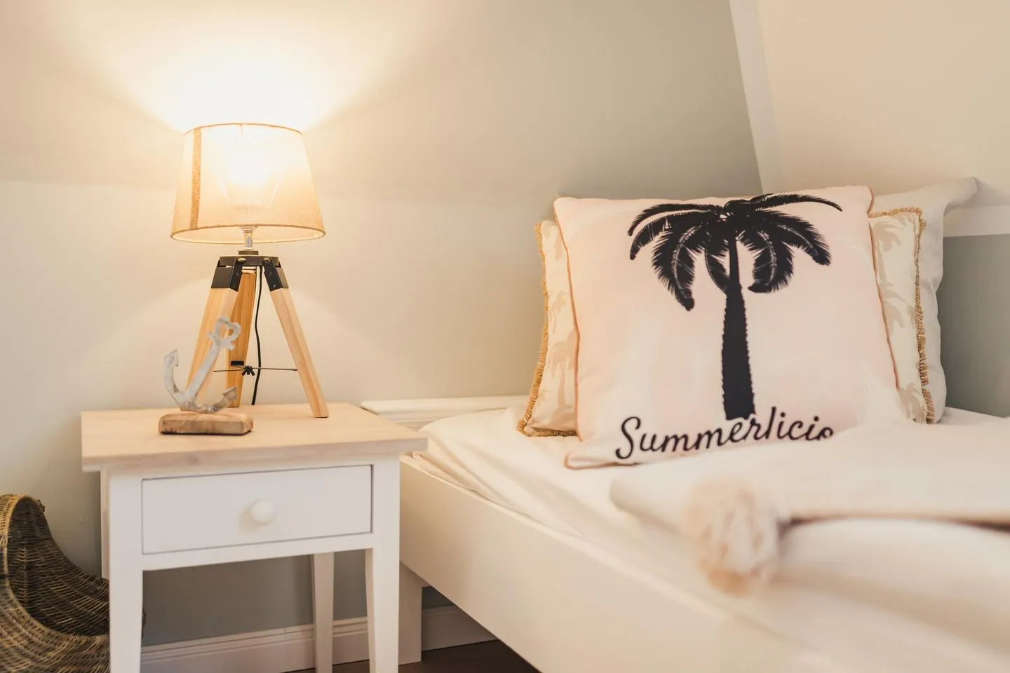 Über den Flur gelangen Sie in das modern gestaltete Schlafzimmer, ausgestattet mit hochwertigen Möbeln im Beach Style, einem komfortablem Boxspringbett und Flatscreen-TV. Hier werden Ihre Urlaubsträume wahr und Sie werden sich sicher wohlfühlen.