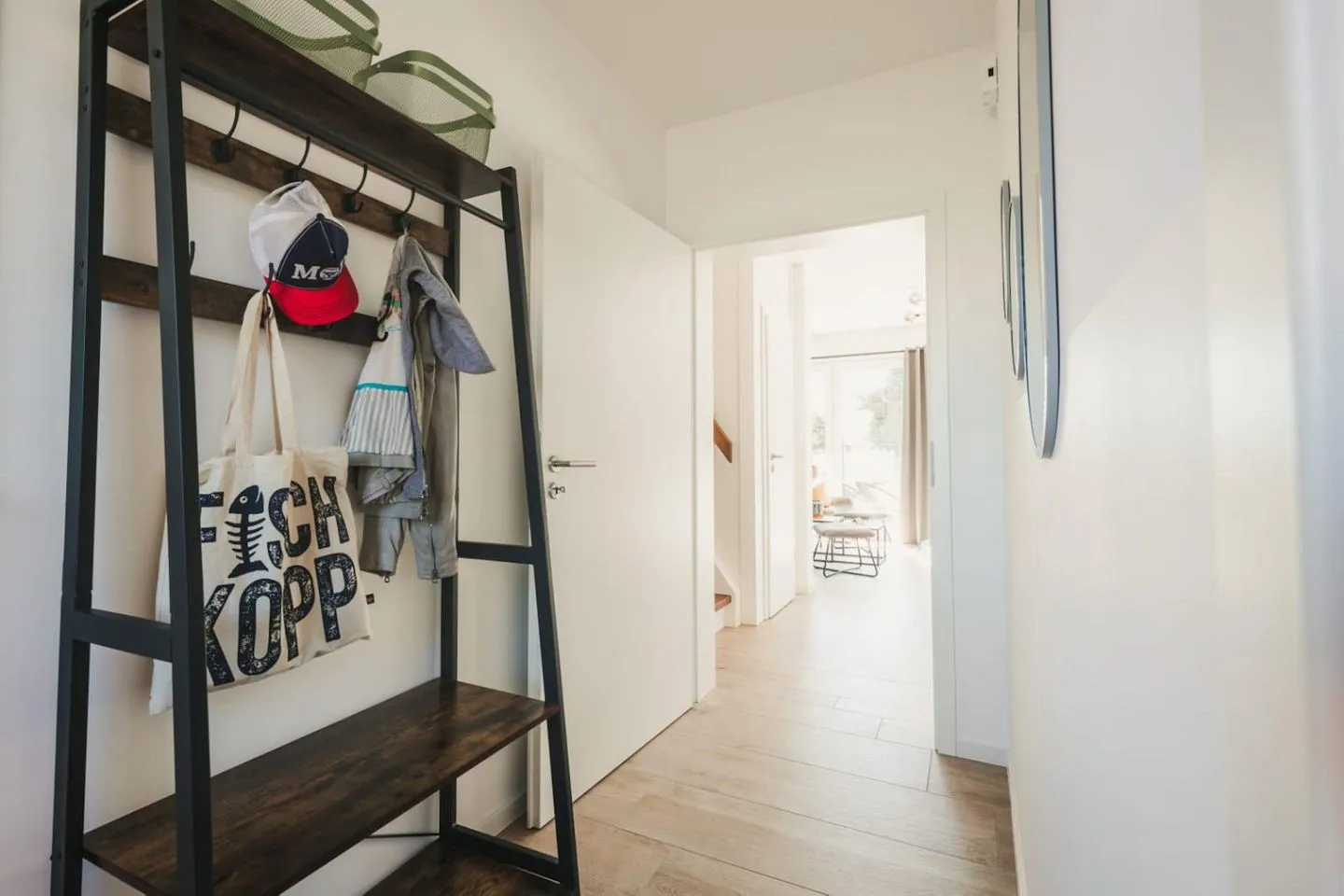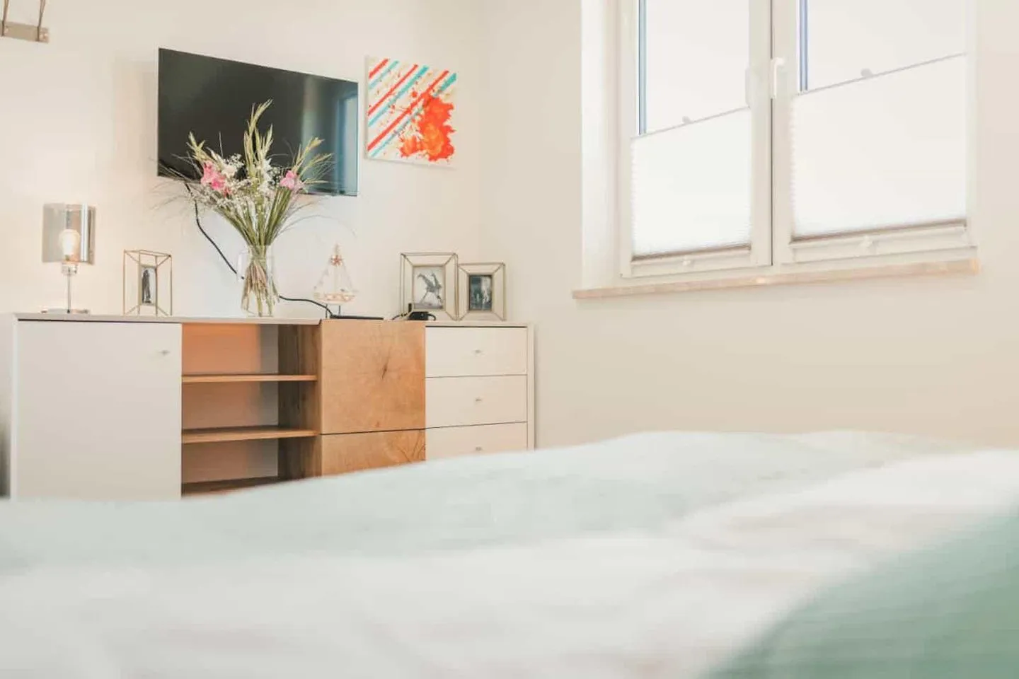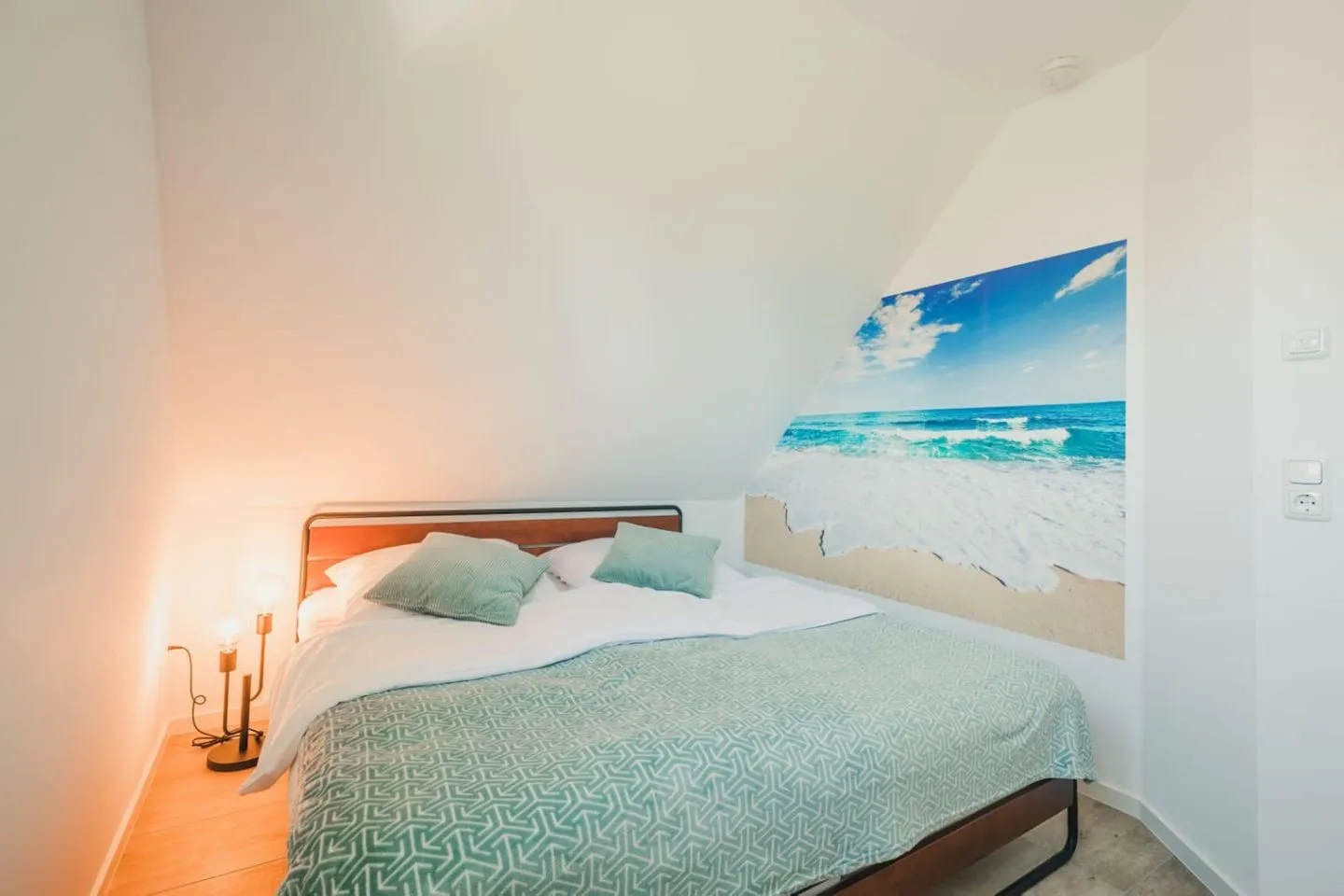 Im Obergeschoss erwarten Sie zwei schicke Schlafzimmer sowie ein Badezimmer mit komfortabler Badewanne und Dusche. Die Zimmer sind hochwertig und gemütlich, mit viel Liebe zum Detail eingerichtet. Die freundliche Atmosphäre trägt dazu bei, dass Sie sich wohl fühlen und die Seele baumeln lassen können. Jeder Schlafraum verfügt über einen eigenen Smart-TV und im größeren Zimmer befindet sich zusätzlich eine bequeme Schlafcouch.