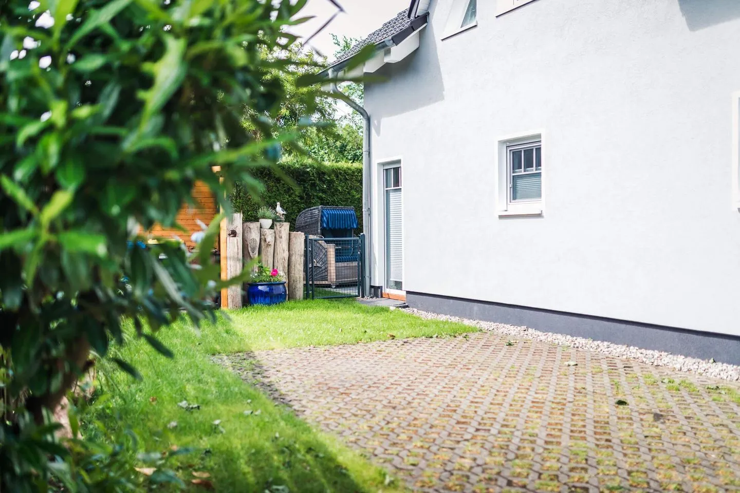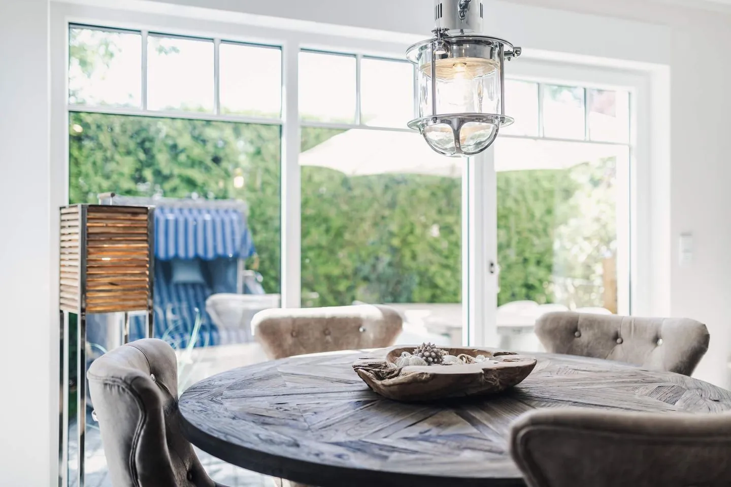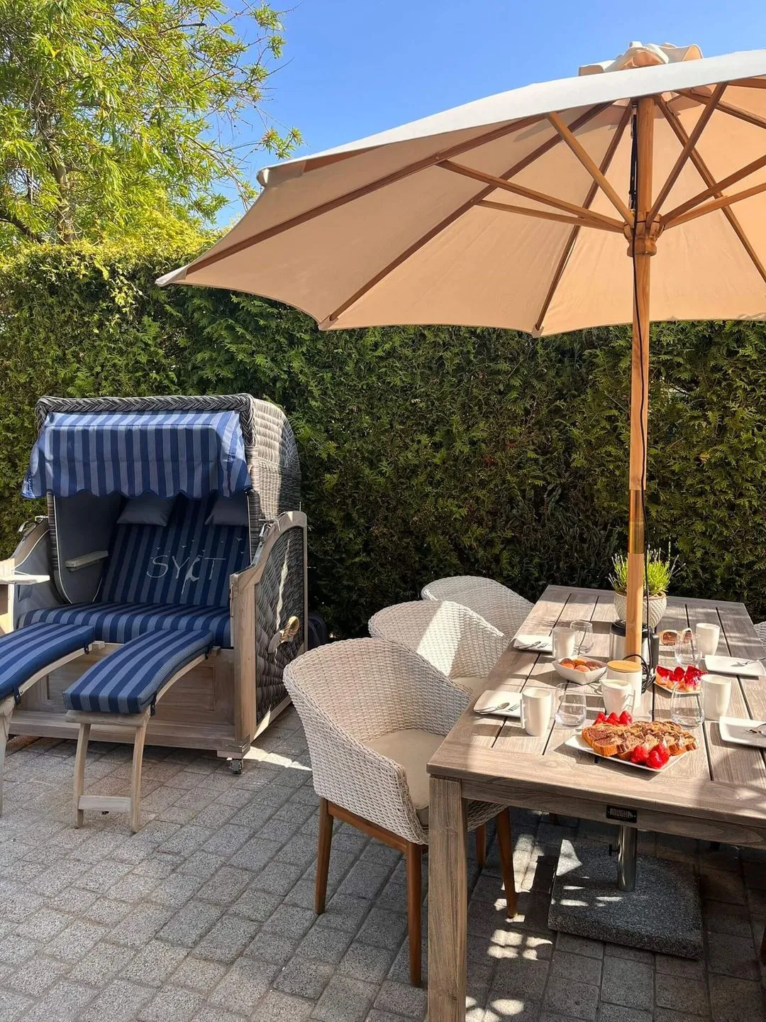 Erholung verspricht auch das Verweilen auf der vor Blicken geschützten geschlossenen Terrasse mit schönen Terrassenmöbeln, Sonnenschirm und Strandkorb.