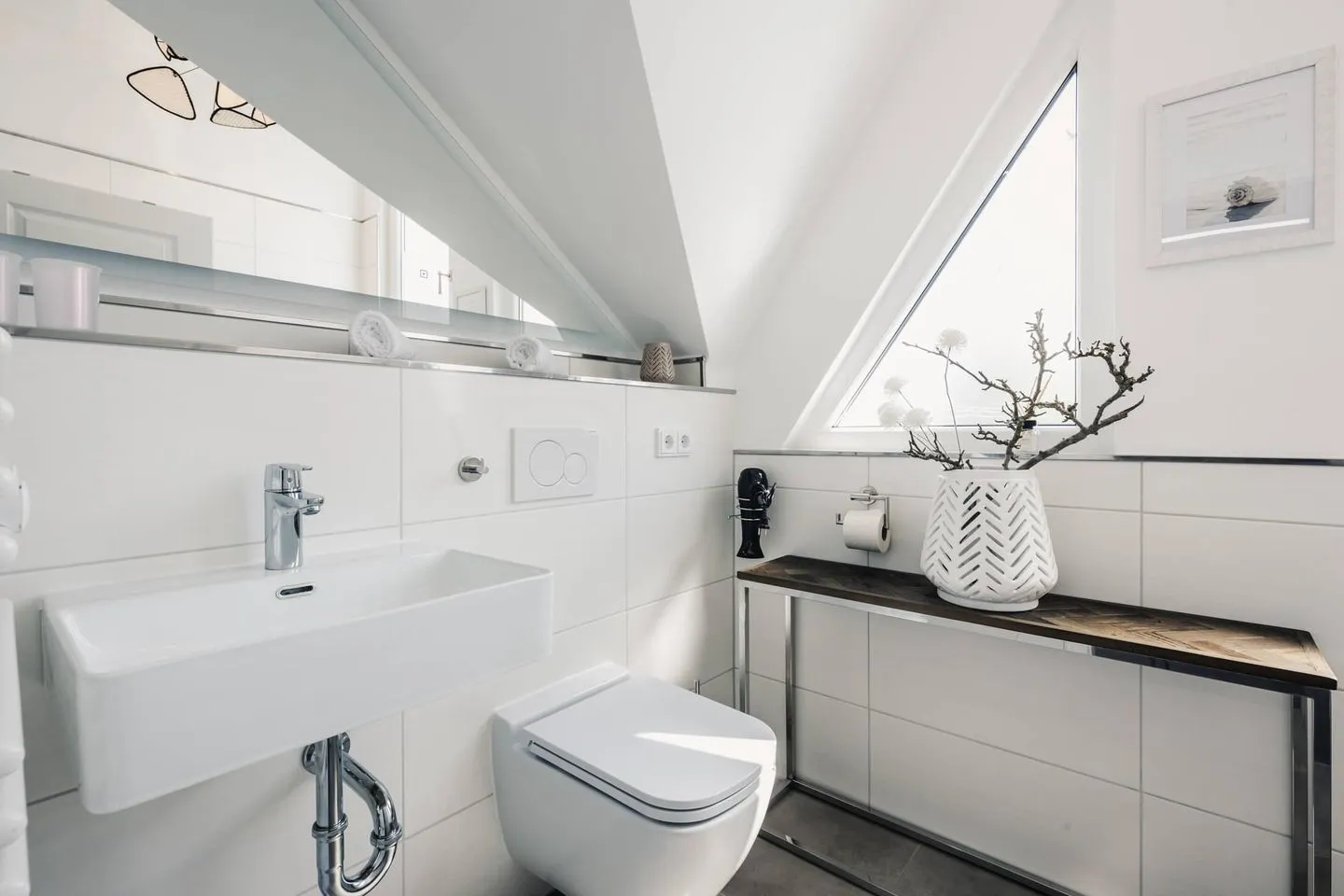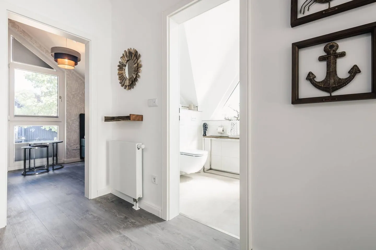 Im Obergeschoss finden Sie ein modernes ansprechendes Wannenbad vor. In beiden Schlafräumen laden komfortable Boxspringbetten zum erholsamen Schlaf ein. Sie finden neues Mobiliar sowie elegante und zugleich maritime Accessoires vor. Weitere zwei bequeme Schlafplätze bietet die hochwertige Schlafcouch im Wohnbereich.
