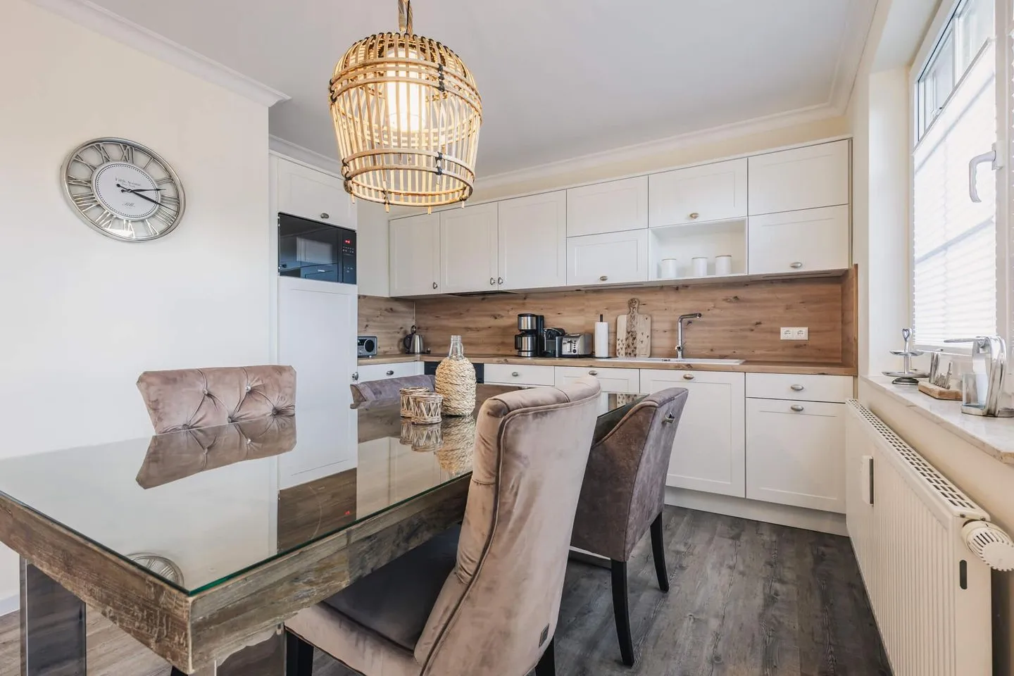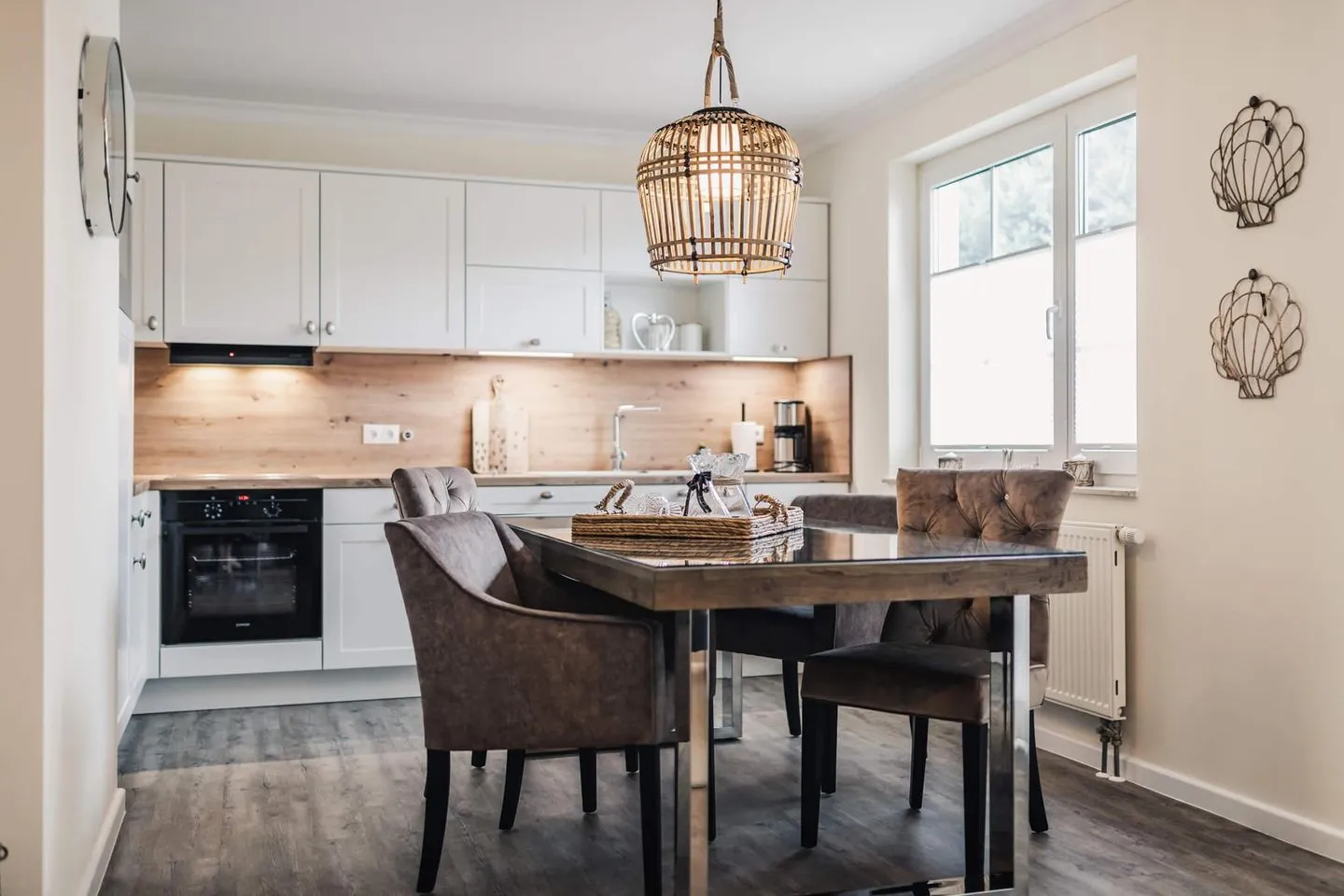 Der großzügige Wohn- und Essbereich lädt zum gemeinsamen Verweilen ein, die daran angeschlossene Küche lässt jeden Hobbykoch aufblühen. Die Küche ist mit erstklassigen Geräten und Utensilien ausgestattet, es wird Ihnen an nichts fehlen.