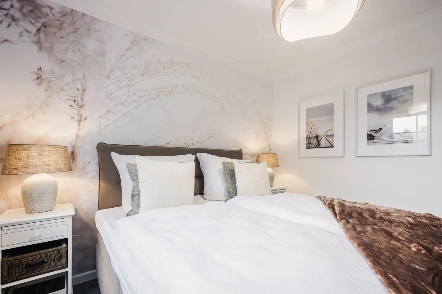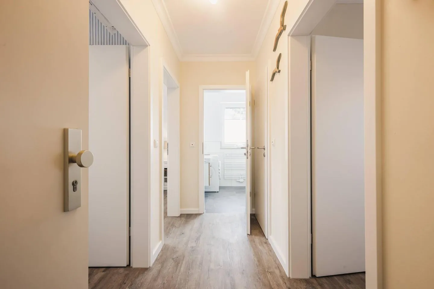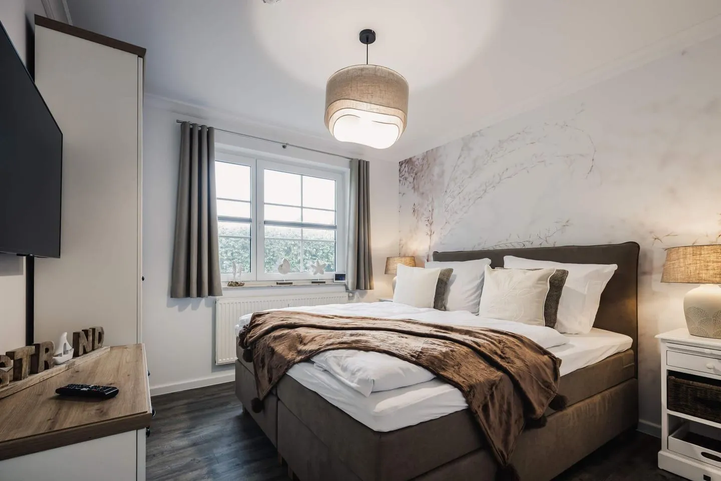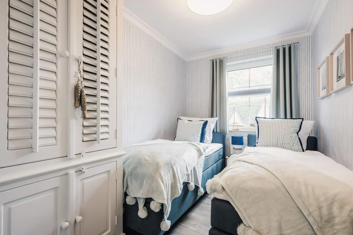 Über den Flur gelangen Sie zu den zwei maritimen Schlafzimmern. Das erste Schlafzimmer verfügt über zwei Boxspring-Einzelbetten und einen Kleiderschrank sowie einen Flatscreen-TV. Das zweite großzügige Schlafzimmer mit einem hochwertigen Doppel-Boxspringbett garantiert Ihnen erholsamen Schlaf. Ein Flatscreen-TV und ein Kleiderschrank stehen Ihnen auch in diesem Schlafzimmer zur Verfügung. Alle Wohn- und Schlafräume verfügen über einen Insektenschutz.