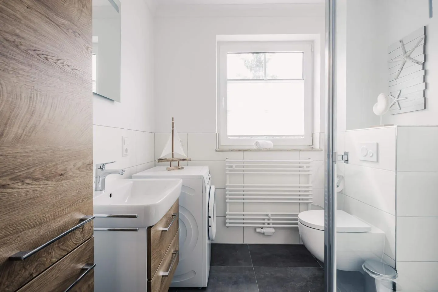 Das neuwertige und modern ausgestattete Bad verfügt neben einem Fenster über eine Dusche, ein WC, einen Waschtisch sowie entsprechende Aufbewahrungsmöglichkeiten in zwei Schränken. Der Mehrwert des Bades wird durch die Waschmaschine abgerundet.