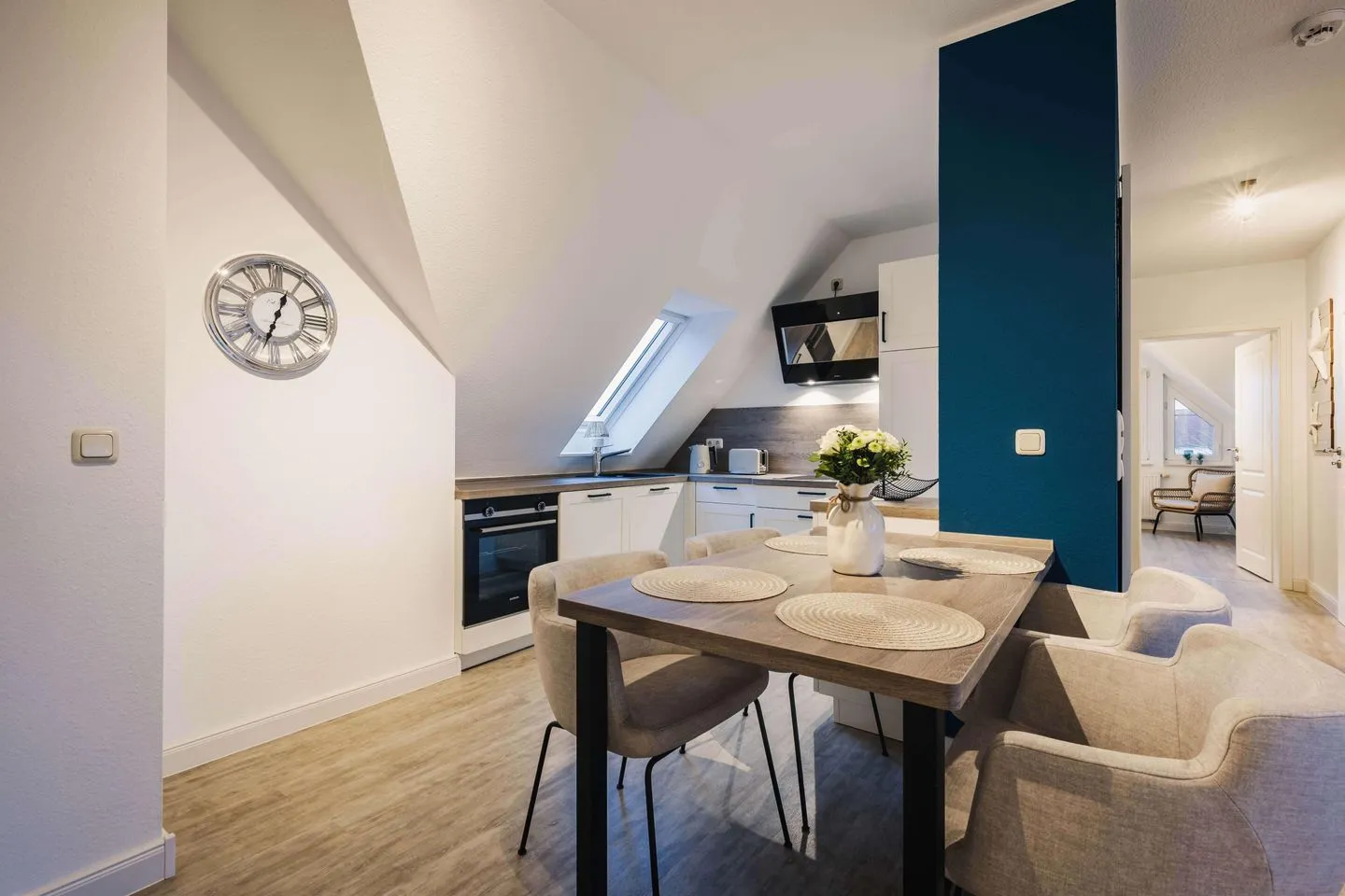 Voll ausgestattete Küche mit Cerankochfeld, Backofen, Kühlschrank und Geschirrspüler