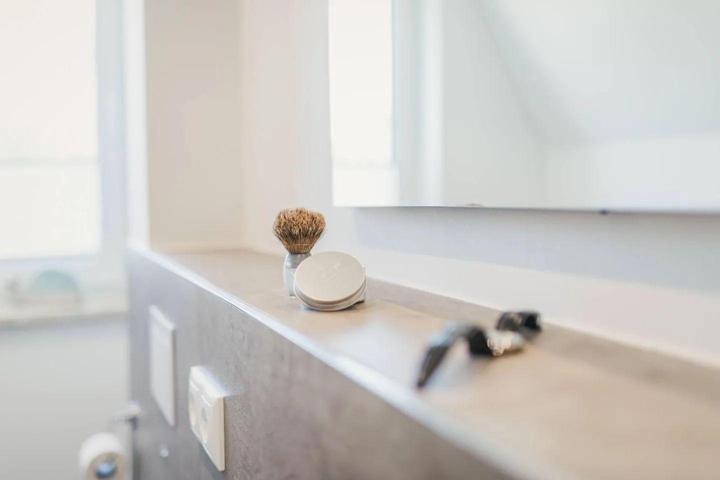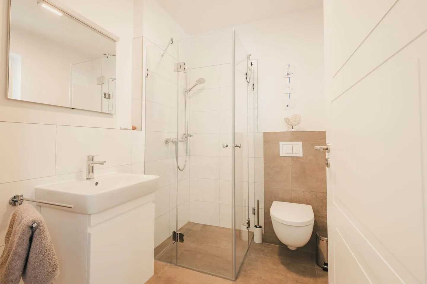 Das Badezimmer im Erdgeschoß hat eine ebenerdige Dusche und ein großes Waschbecken. Die warmen Sandtöne spiegeln das maritime Umfeld wider.