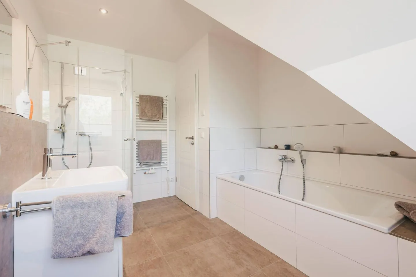 Das Badezimmer im Obergeschoß bietet neben einer ebenerdigen Dusche zusätzlich eine große Badewanne. Hier entspannen Sie nach langen Spaziergängen in der Natur.
