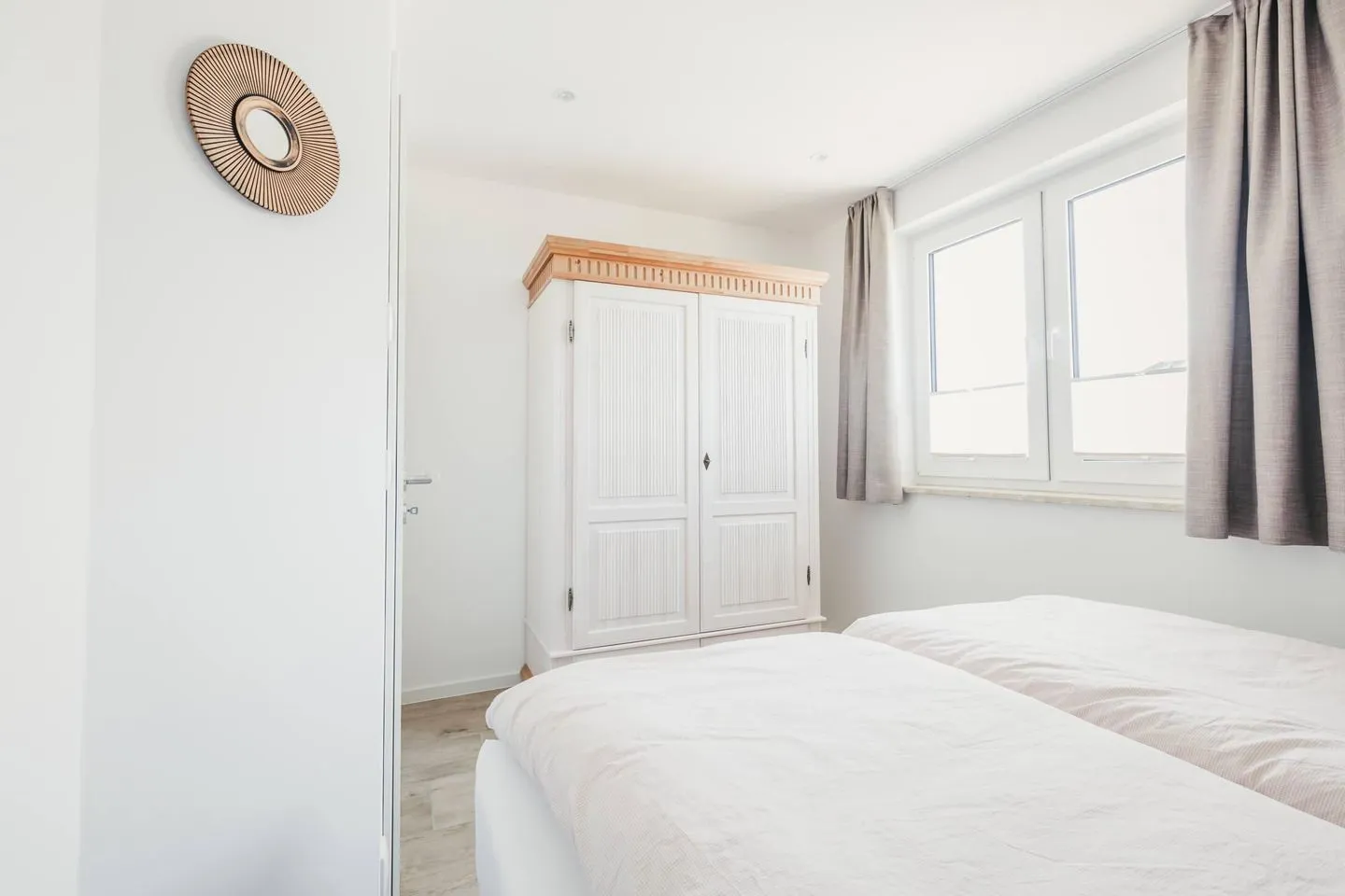 Im Obergeschoß befinden sich zwei Schlafzimmer mit jeweils einem großen, 1,80 Meter breiten, Boxspringbett und einem Kleiderschrank. Aus beiden Zimmern haben Sie einen traumhaften Blick auf die umgebende Natur und den Bodden. Das größere Zimmer verfügt über bodentiefe Fenster, ein Smart TV und einen gemütlichen Sessel.