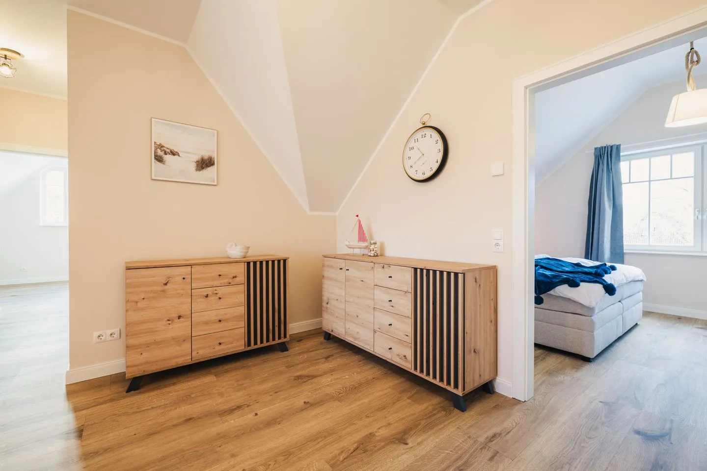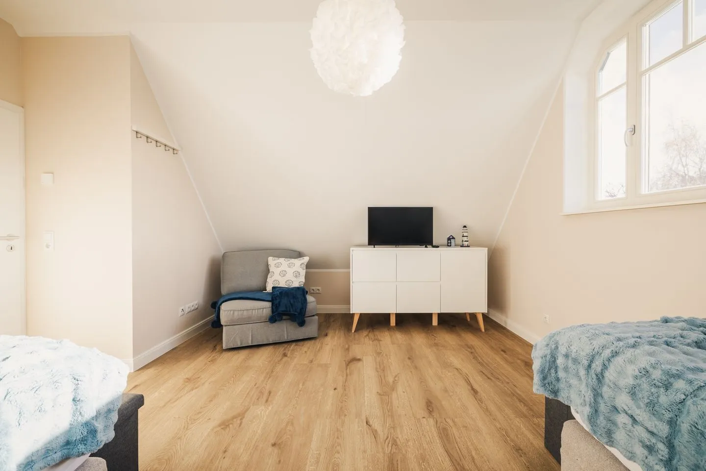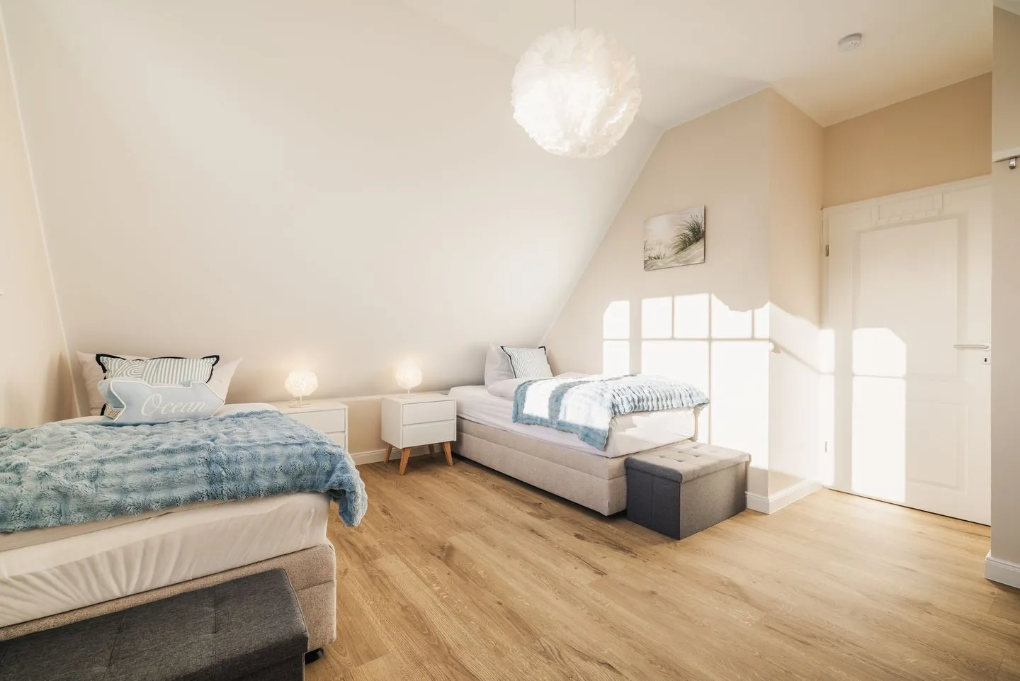 Die Wohnung verfügt über zwei separate Schlafzimmer. Das Hauptschlafzimmer ist mit einem Boxspring-Doppelbettausgestattet. Das zweite Schlafzimmer bietet flexible Schlafmöglichkeiten mit zwei Boxspring-Einzelbetten und einem komfortablen Schlafsessel für die 5. Person. Wohnzimmer und zweites Schlafzimmer verfügen über ein TV-Gerät. Eine moderne, voll ausgestattete Küche inkl. Nespressomaschine wartet auf Sie. Im Badezimmer befindet sich eine bodengleiche Dusche sowie ein Waschtrockner.