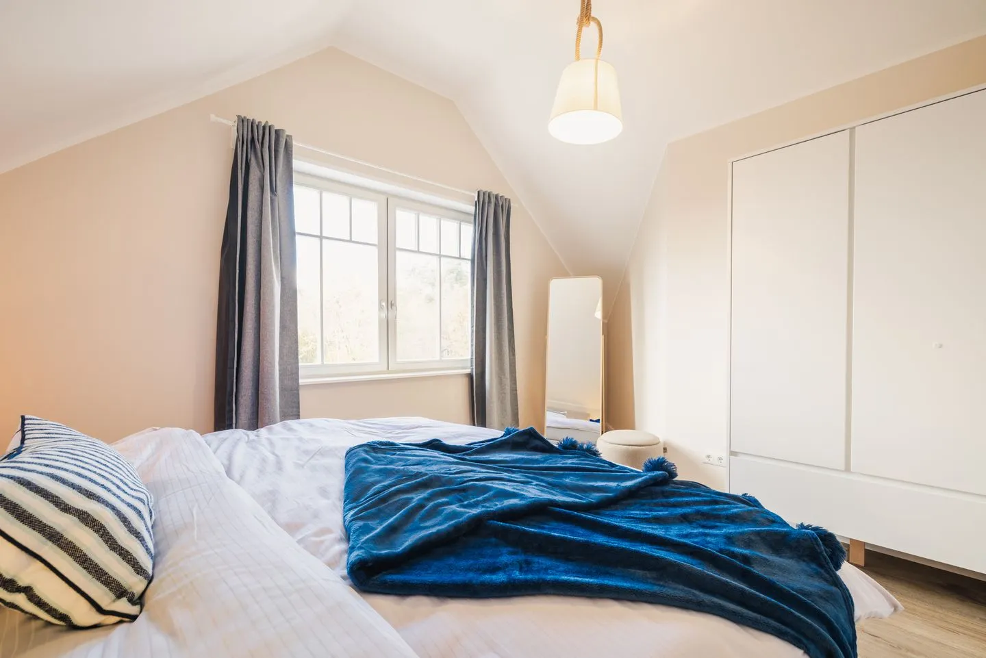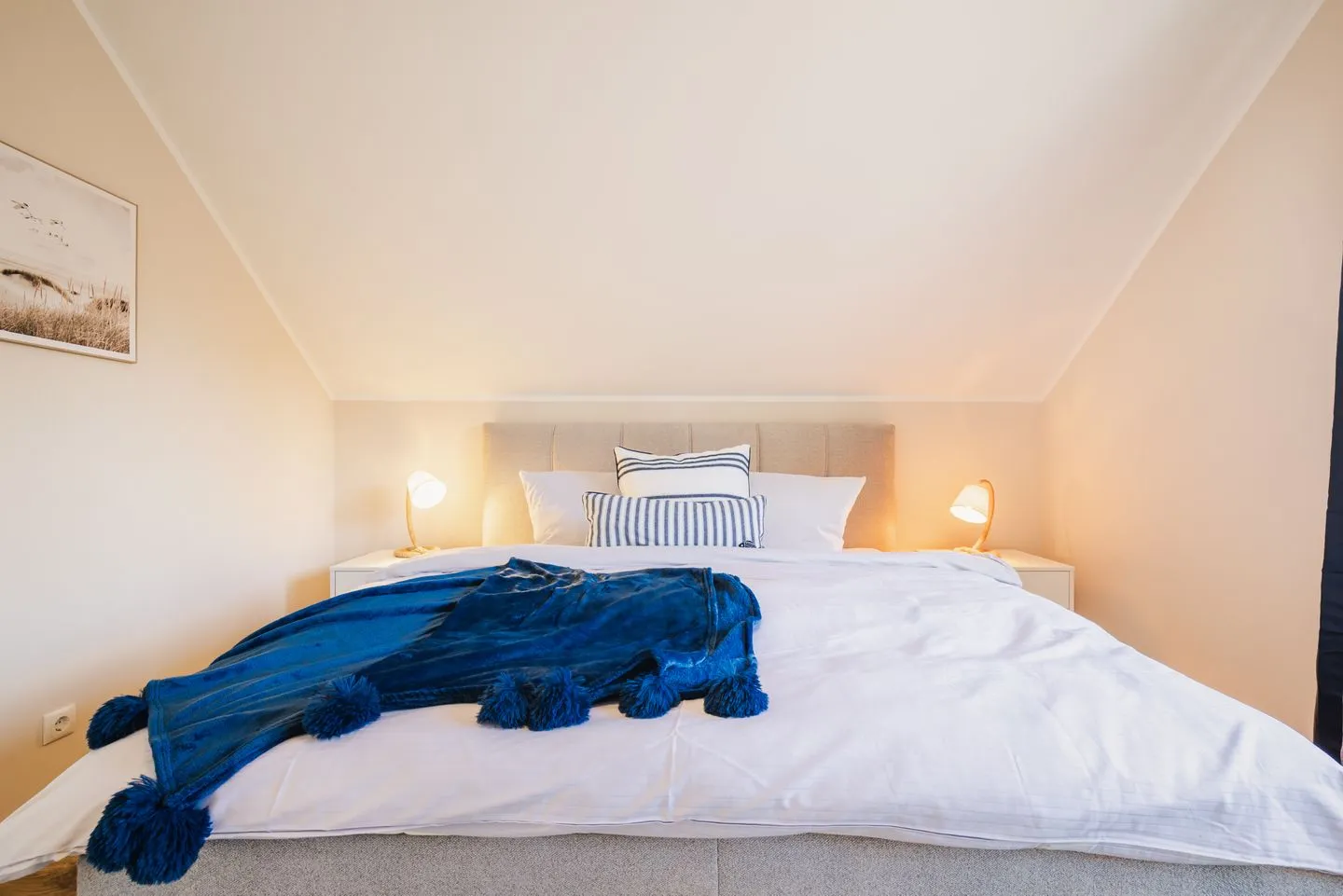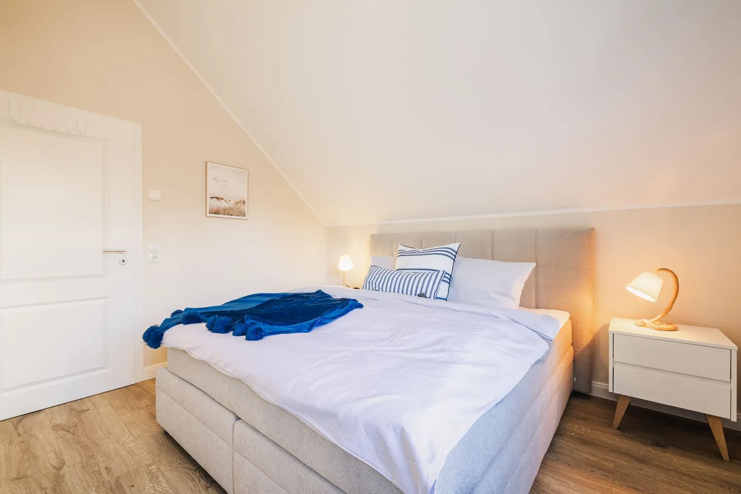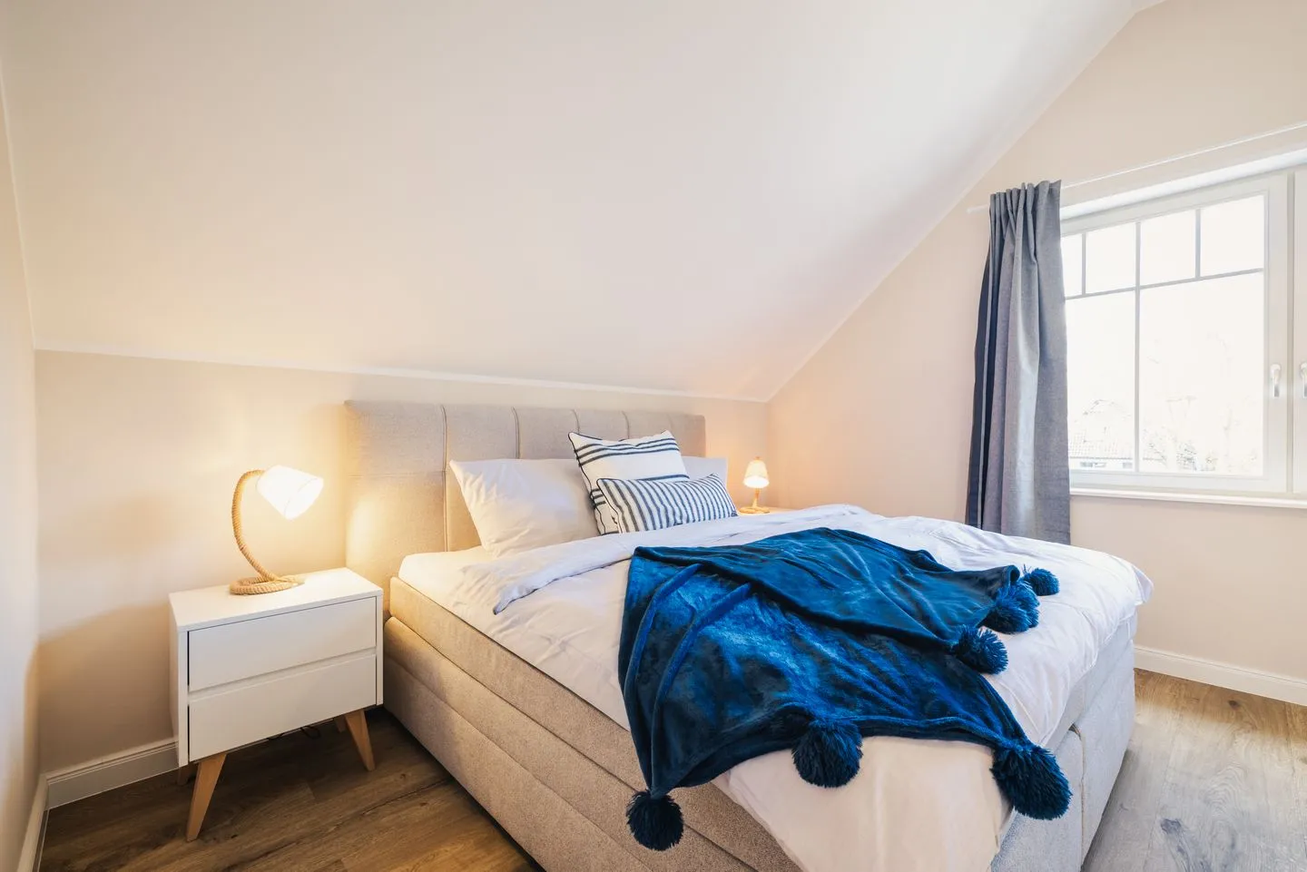 Die Wohnung verfügt über zwei separate Schlafzimmer. Das Hauptschlafzimmer ist mit einem Boxspring-Doppelbettausgestattet. Das zweite Schlafzimmer bietet flexible Schlafmöglichkeiten mit zwei Boxspring-Einzelbetten und einem komfortablen Schlafsessel für die 5. Person. Wohnzimmer und zweites Schlafzimmer verfügen über ein TV-Gerät. Eine moderne, voll ausgestattete Küche inkl. Nespressomaschine wartet auf Sie. Im Badezimmer befindet sich eine bodengleiche Dusche sowie ein Waschtrockner.