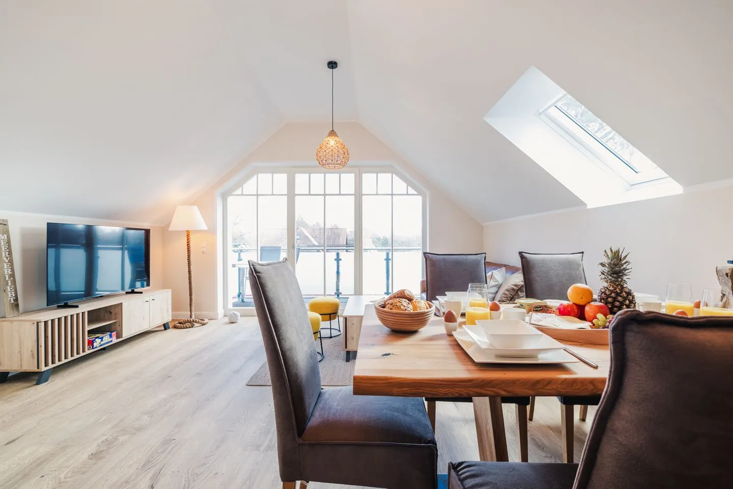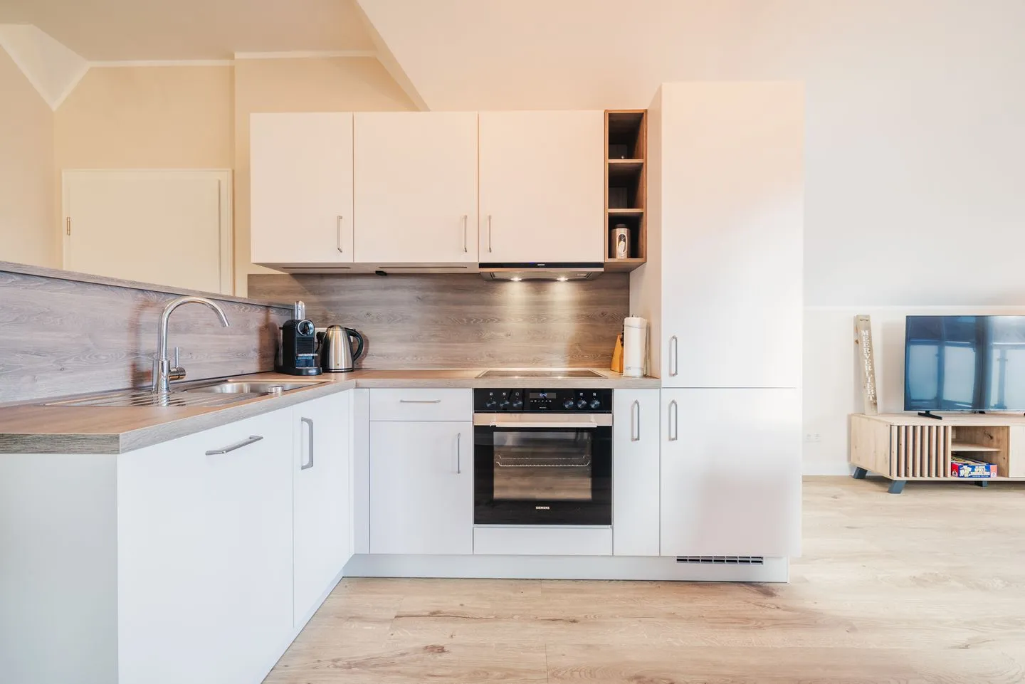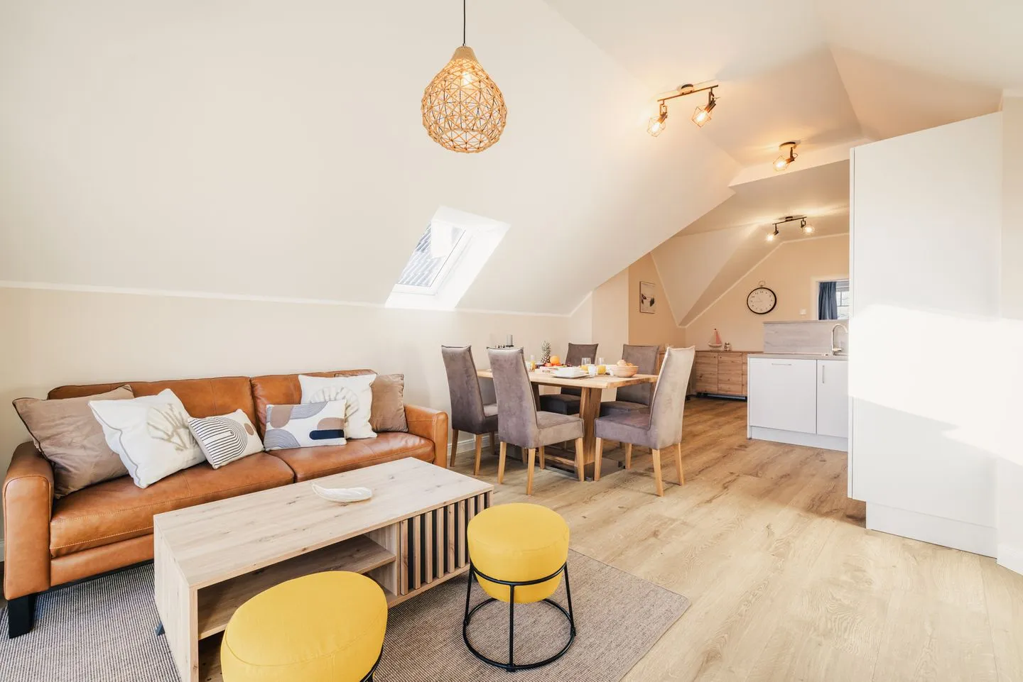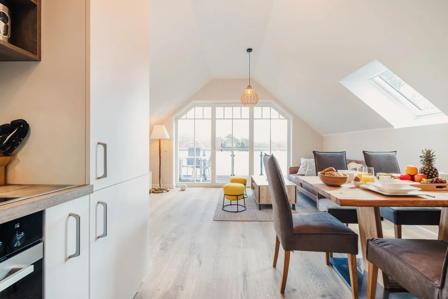 Das lichtdurchflutete Apartment besticht durch eine einzigartige Loft-Atmosphäre. Der großzügige offene Wohn-, Ess- und Küchenbereich wird durch hohe Decken noch verstärkt. Das Design ist hell und freundlich, wobei viel Holz eine besonders gemütliche und moderne Wohlfühlatmosphäre kreiert.