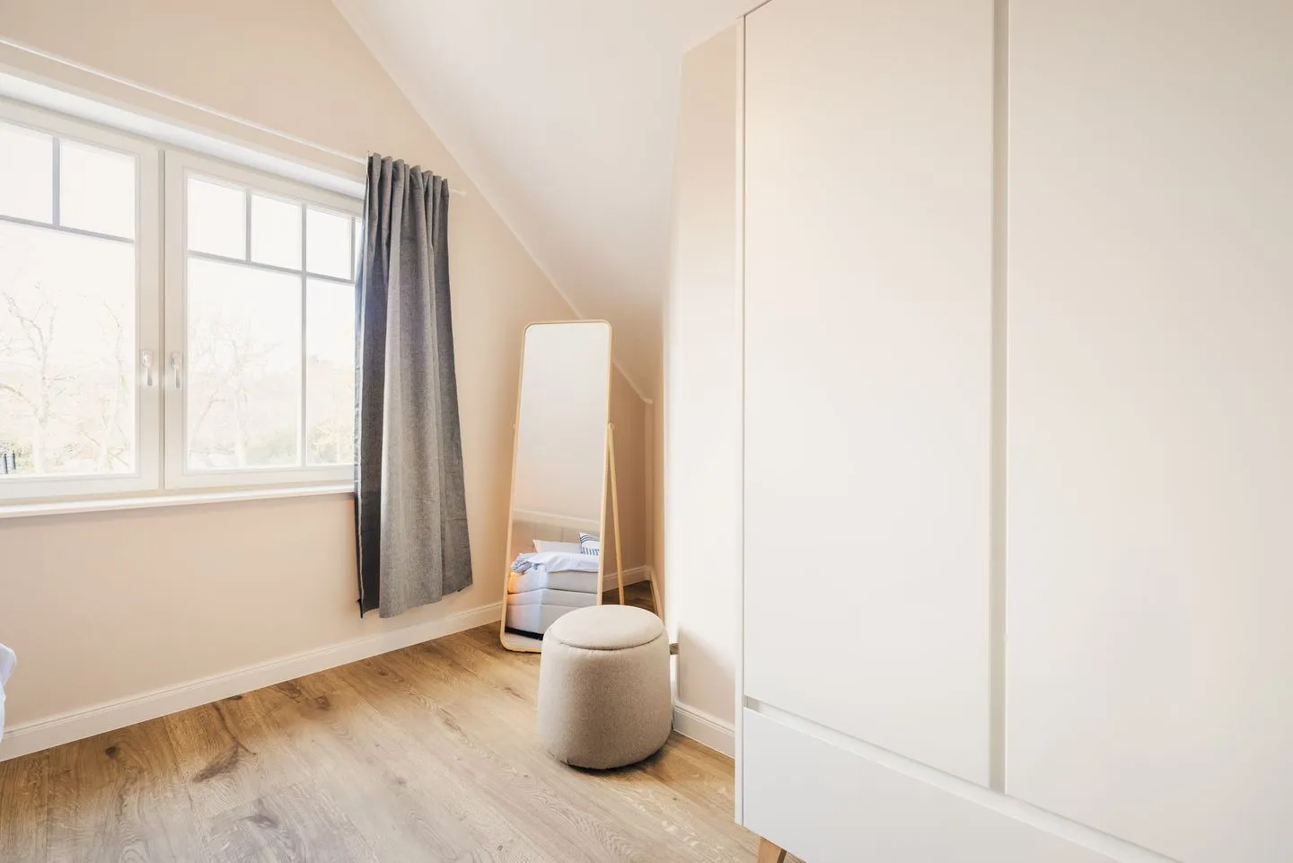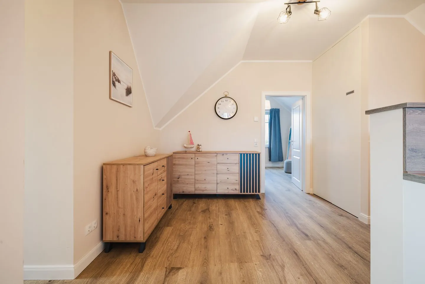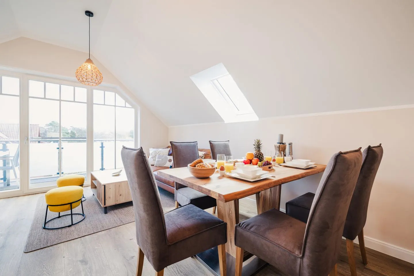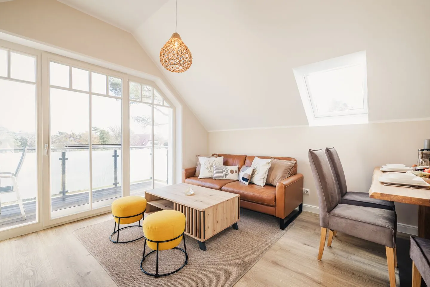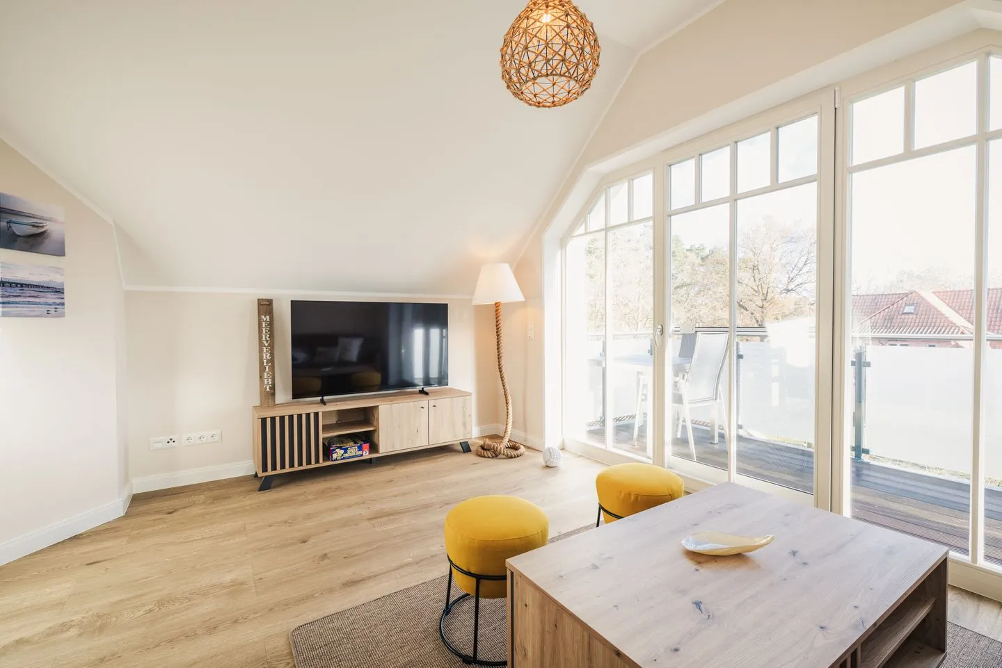 Das lichtdurchflutete Apartment besticht durch eine einzigartige Loft-Atmosphäre. Der großzügige offene Wohn-, Ess- und Küchenbereich wird durch hohe Decken noch verstärkt. Das Design ist hell und freundlich, wobei viel Holz eine besonders gemütliche und moderne Wohlfühlatmosphäre kreiert.