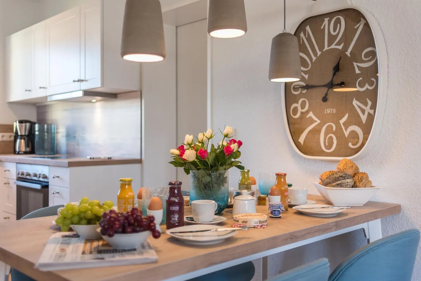 Im Erdgeschoss befindet sich ein komfortabler Wohnbereich mit offener Küche und gemütlichem Essbereich. Die Küche ist voll ausgestattet.