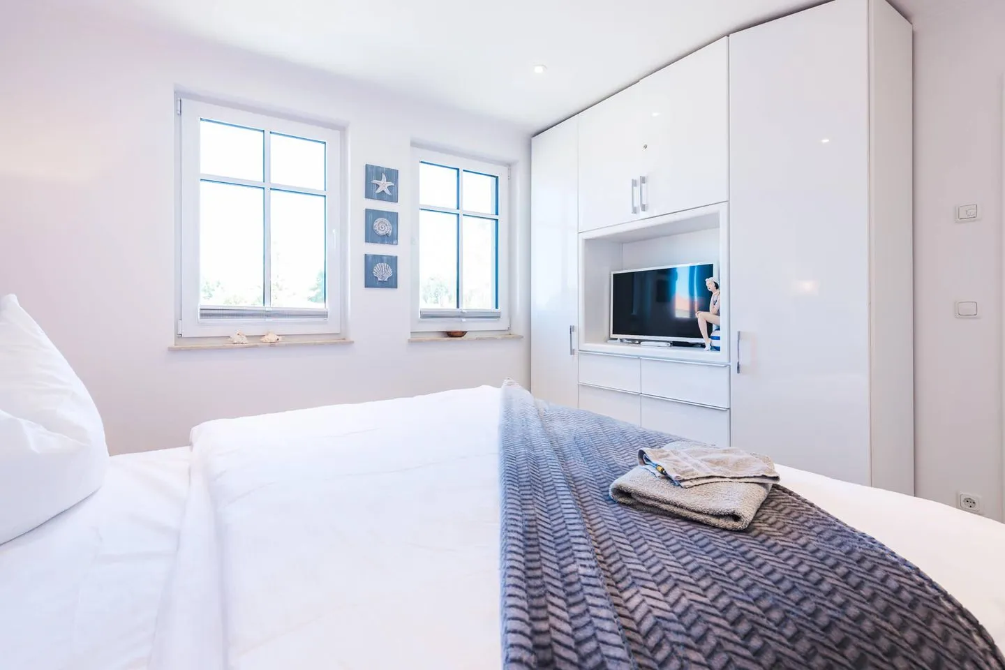 Das Schlafzimmer mit dem bequemen Boxspring-Doppelbett und maritimen Design ist mit einem zusätzlichem Fernseher ausgestattet. Das zweite Schlafzimmer mit zwei Einzelbetten verfügt ebenfalls über einen Fernseher.