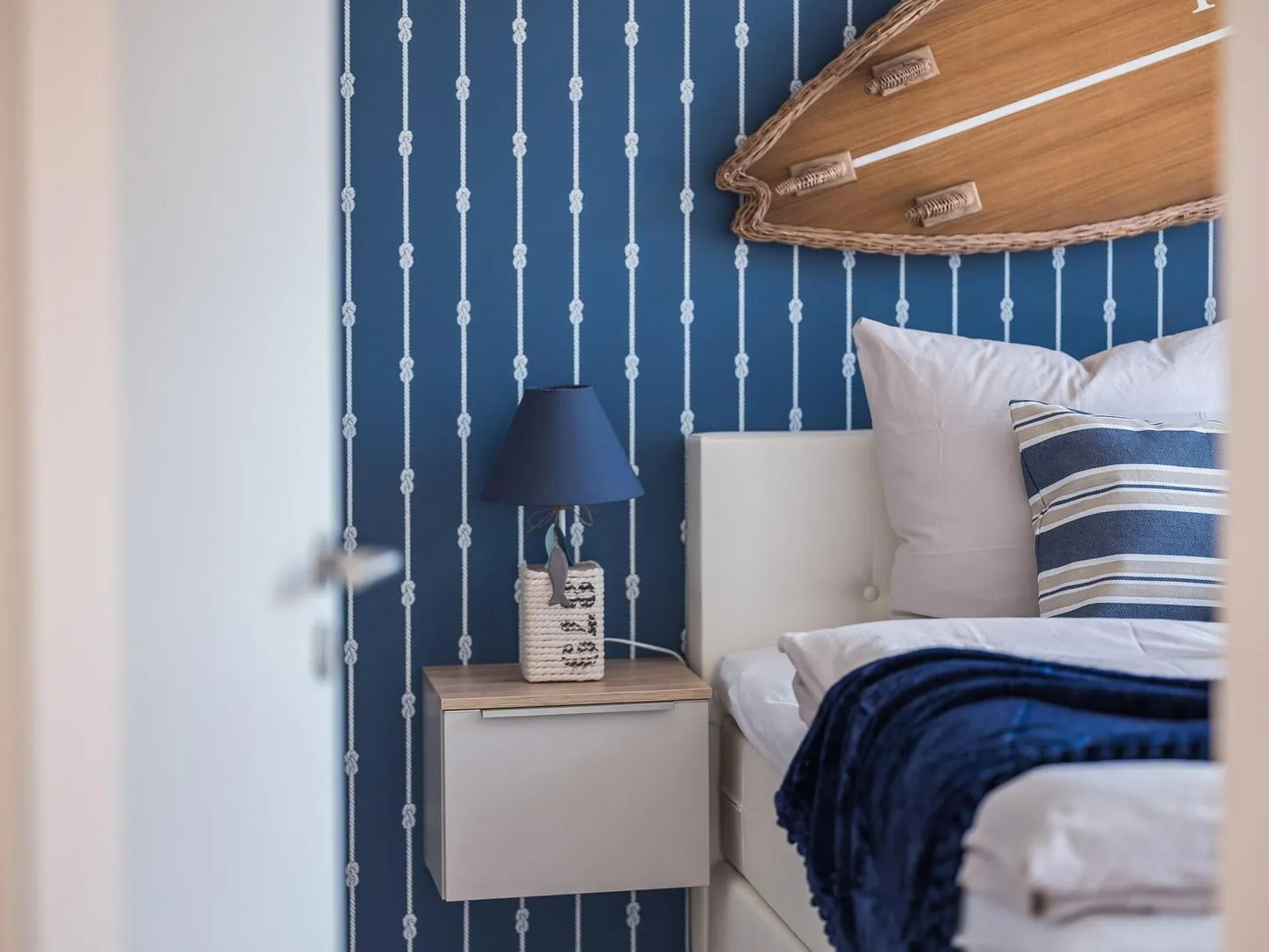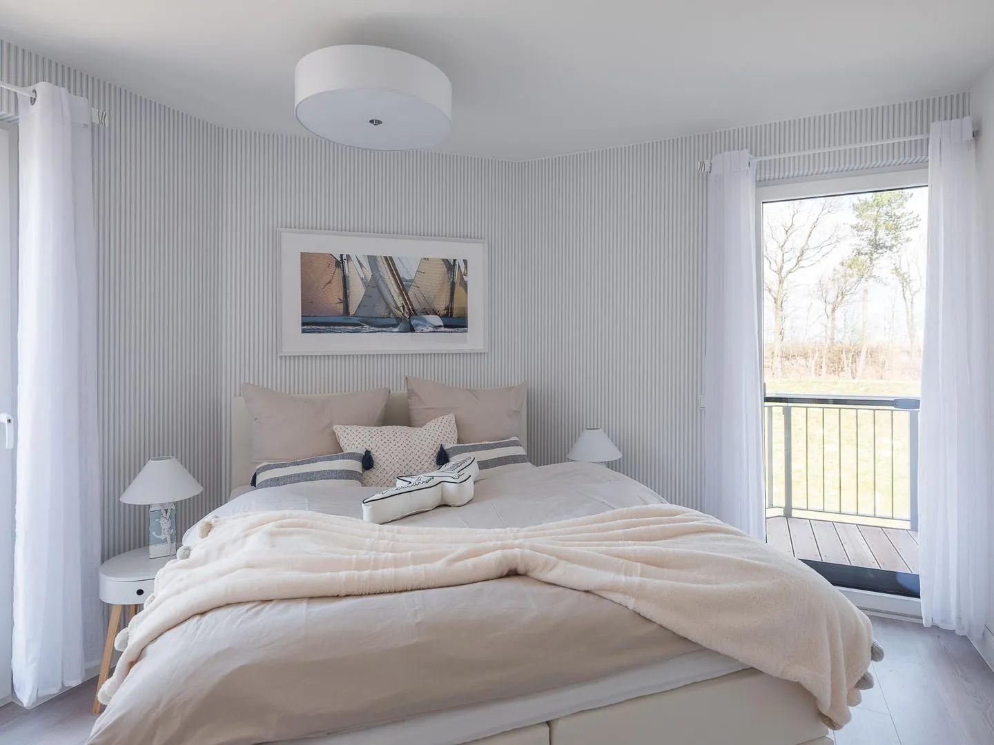 Bodentiefe Fenster lassen den maritimen und zugleich eleganten Charme des lichtdurchfluteten Apartments besonders zur Geltung kommen.