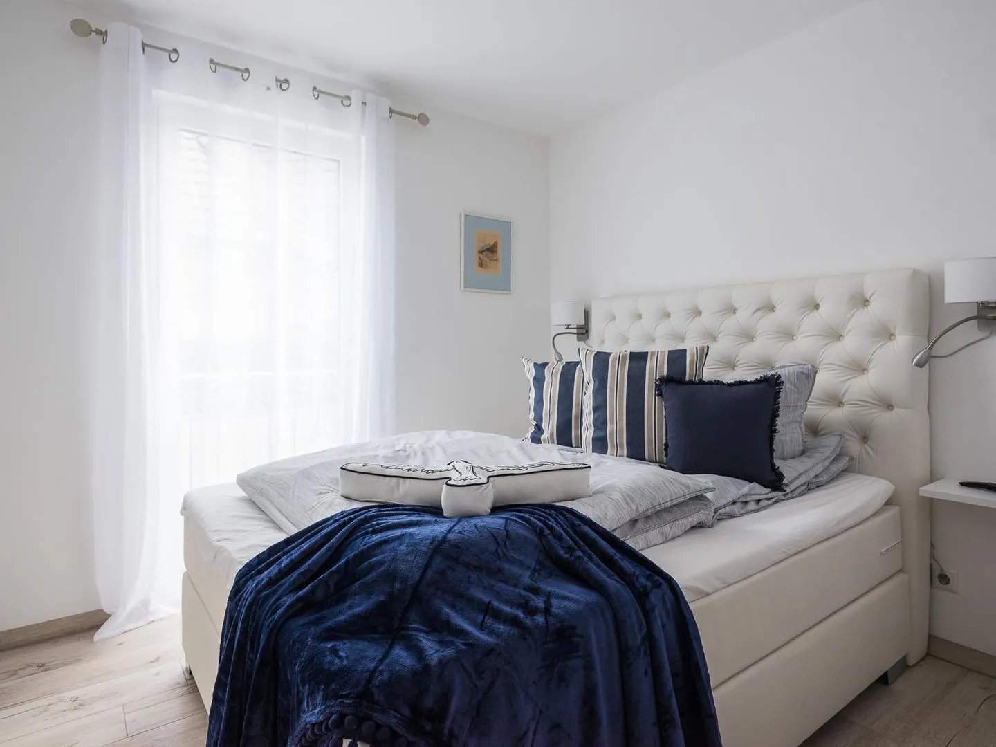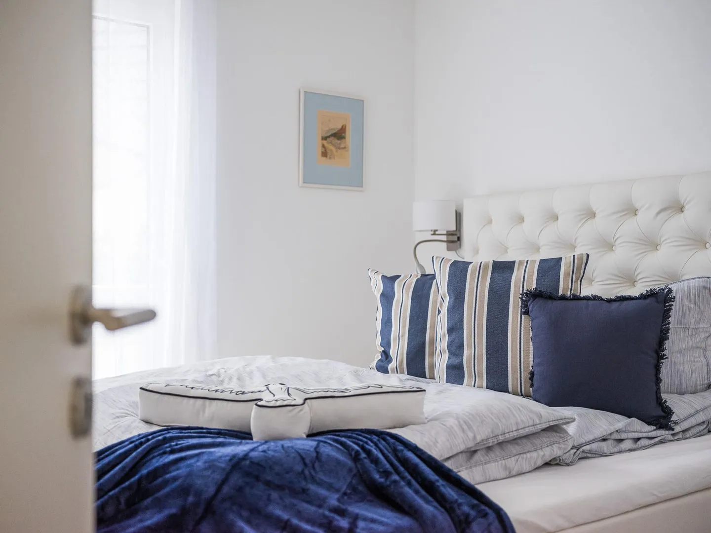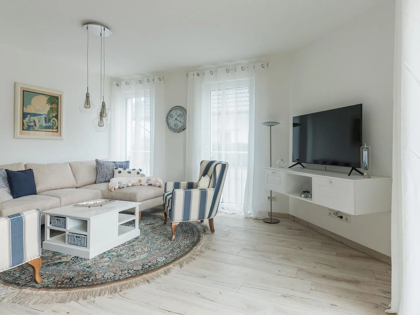 Die bodentiefen Fenster lassen den maritimen und zugleich eleganten Charme des lichtdurchfluteten Apartments besonders zur Geltung kommen.