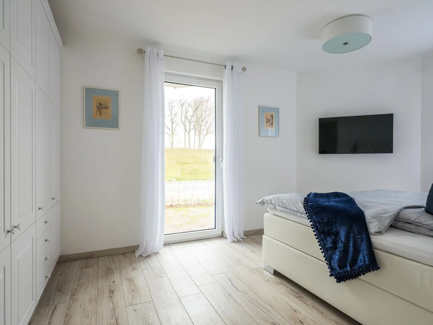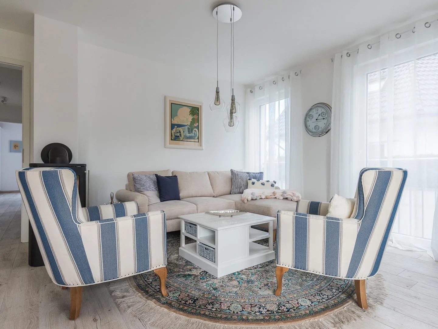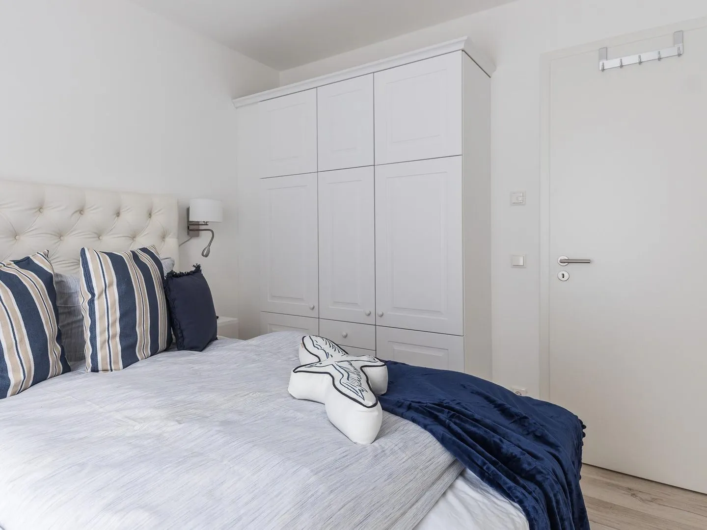 Die bodentiefen Fenster lassen den maritimen und zugleich eleganten Charme des lichtdurchfluteten Apartments besonders zur Geltung kommen.