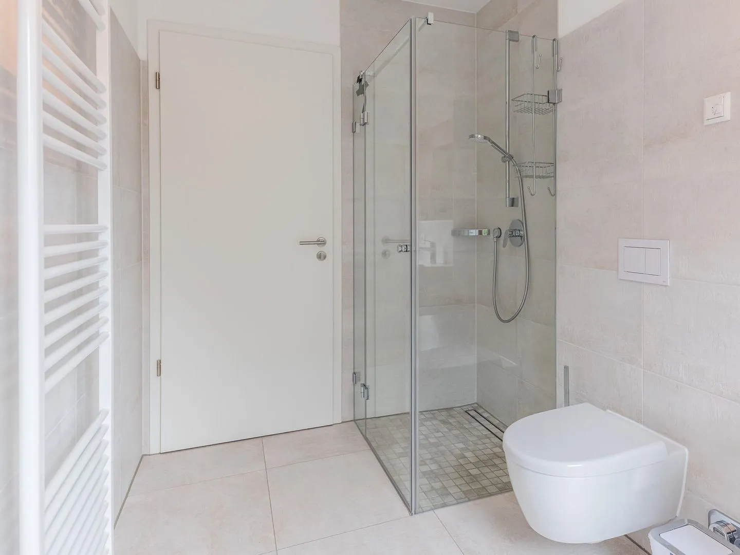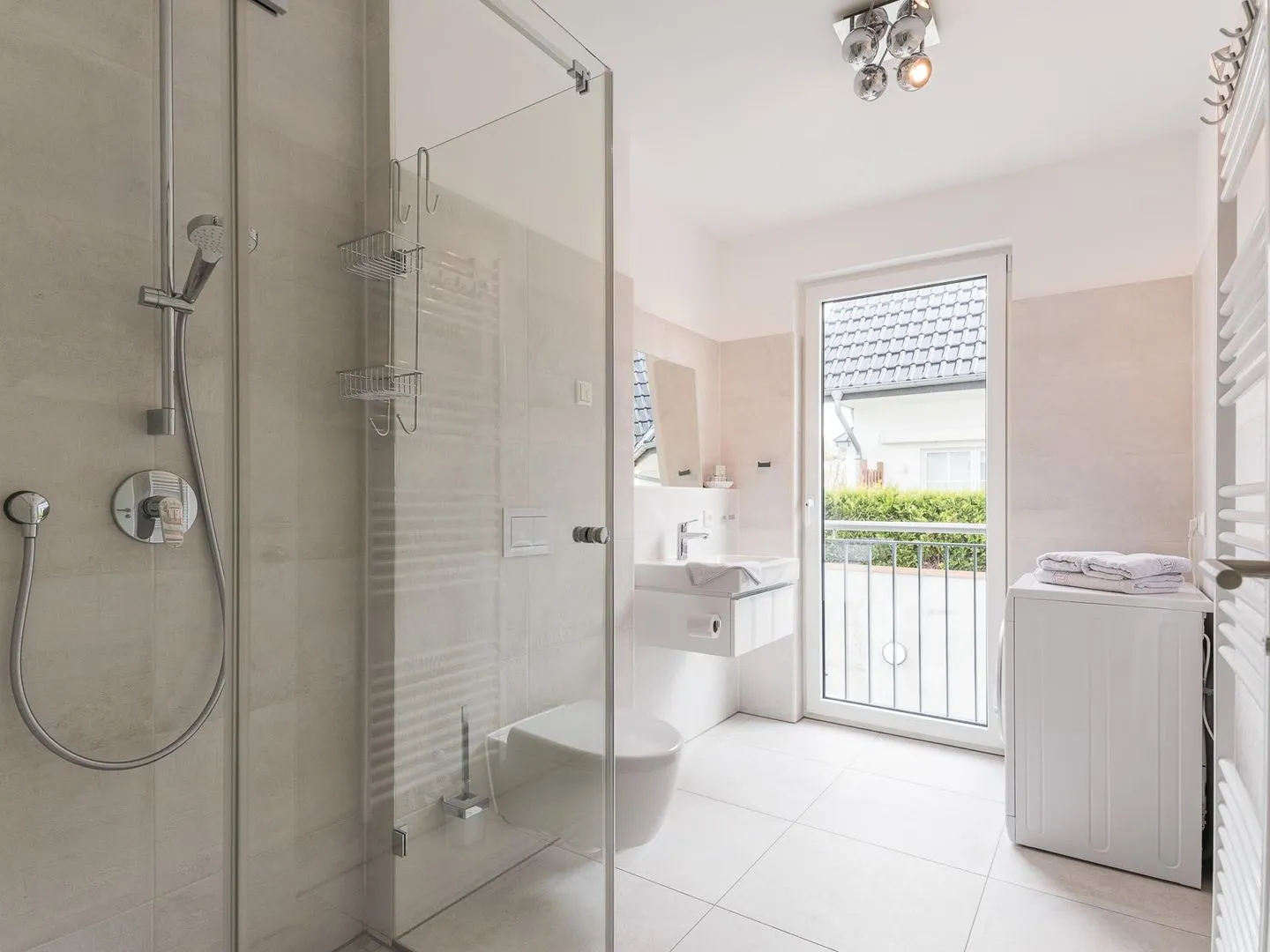 Das modern eingerichtete Badezimmer ist mit einer hochwertigen Dusche ausgestattet und verfügt über eine Waschmaschine mit Trocknerfunktion.