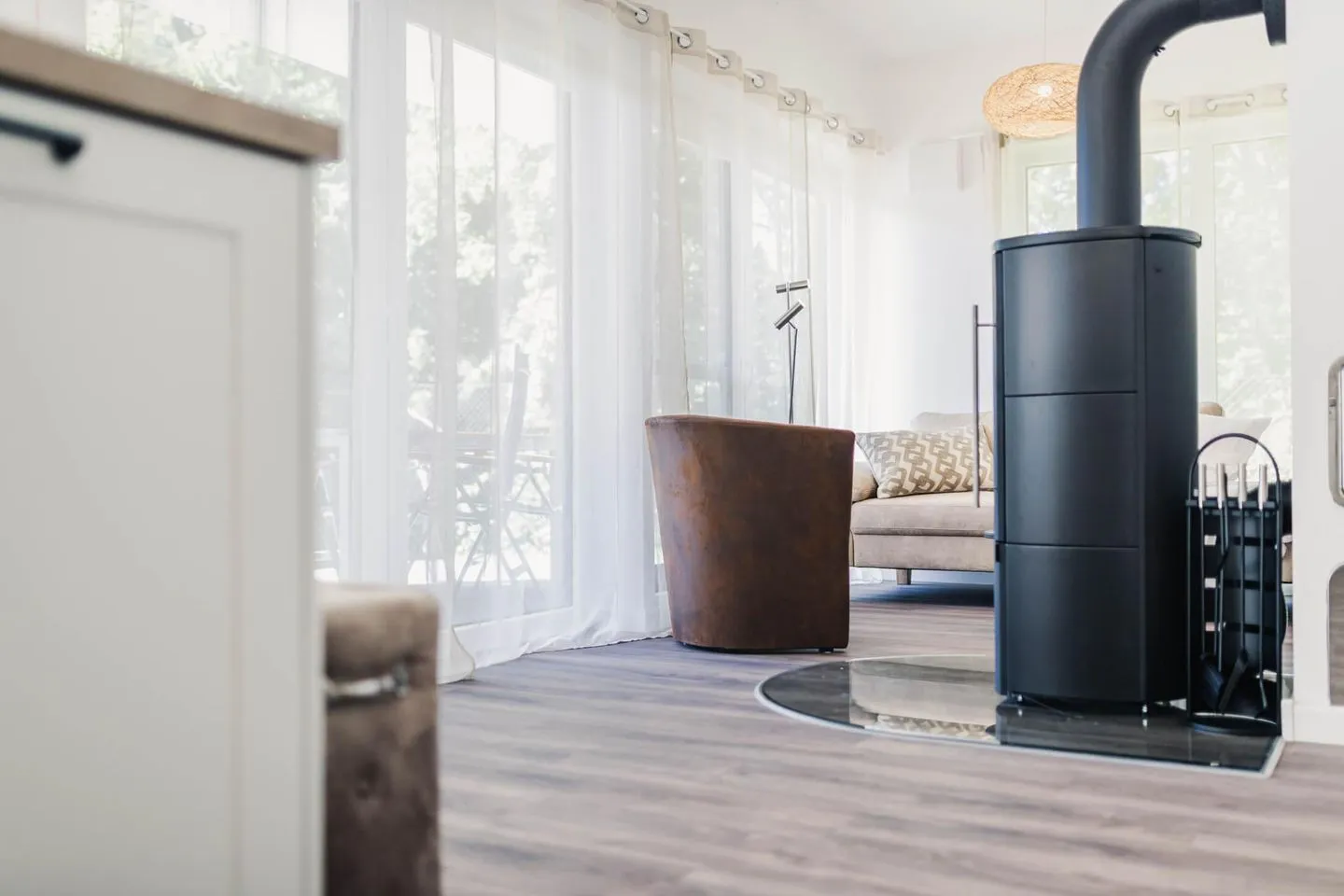 Im behaglichen Wohnbereich spendet ein Kamin an kühlen Abenden oder nach einer langen Fahrradtour Gemütlichkeit und wohlige Wärme. Ein Flachbildfernseher für Ihre Unterhaltung und ein Esstisch runden den Wohn- und Essbereich ab.