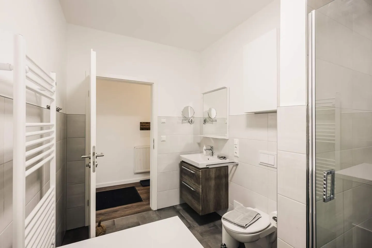 Das moderne Bad mit Fußbodenheizung bietet Ihnen auch eine bodengleiche Dusche sowie eine Waschmaschine.