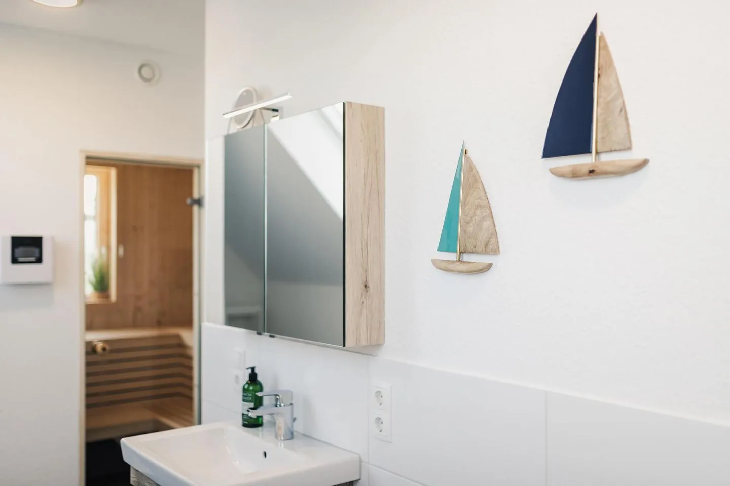 Zusätzlich zu den Schlafzimmern finden Sie in unserem Ferienhaus auch zwei moderne Badezimmer. Diese sind mit Duschen, eins zusätzlich mit einer Badewanne und Sauna ausgestattet und bieten Ihnen den Komfort, den Sie während Ihres Aufenthalts benötigen.