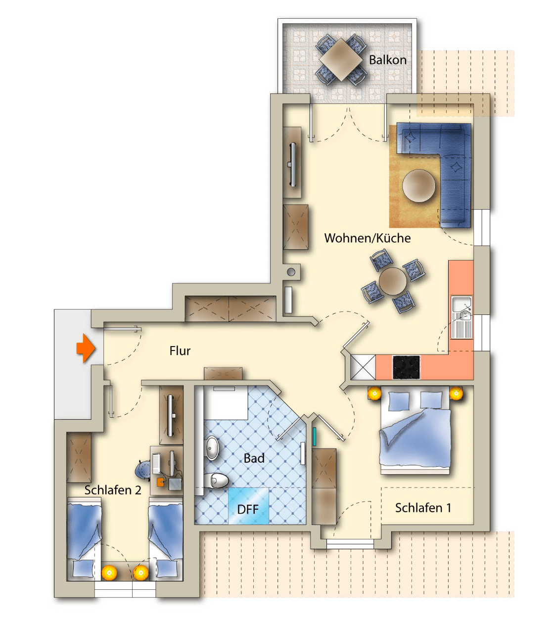 - Zwei Schlafzimmer: Erholsamer Schlaf ist garantiert. Das Schlafzimmer mit den zwei Einzelbetten verfügt zusätzlich über einen TV. Ein Schlafzimmer bietet zudem einen integrierten Arbeitsplatz, ideal für alle, die auch im Urlaub kurz online sein müssen.