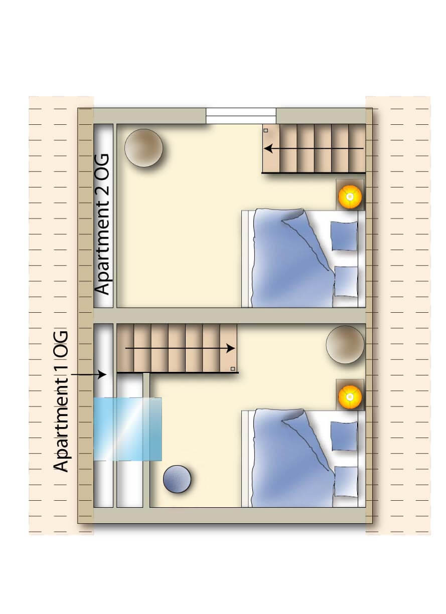 Ruhe und Entspannung im Obergeschoss: Über eine schmale Treppe gelangen Sie in das offene Obergeschoss, wo Sie ein Schlafzimmer mit komfortablen Betten erwartet.
