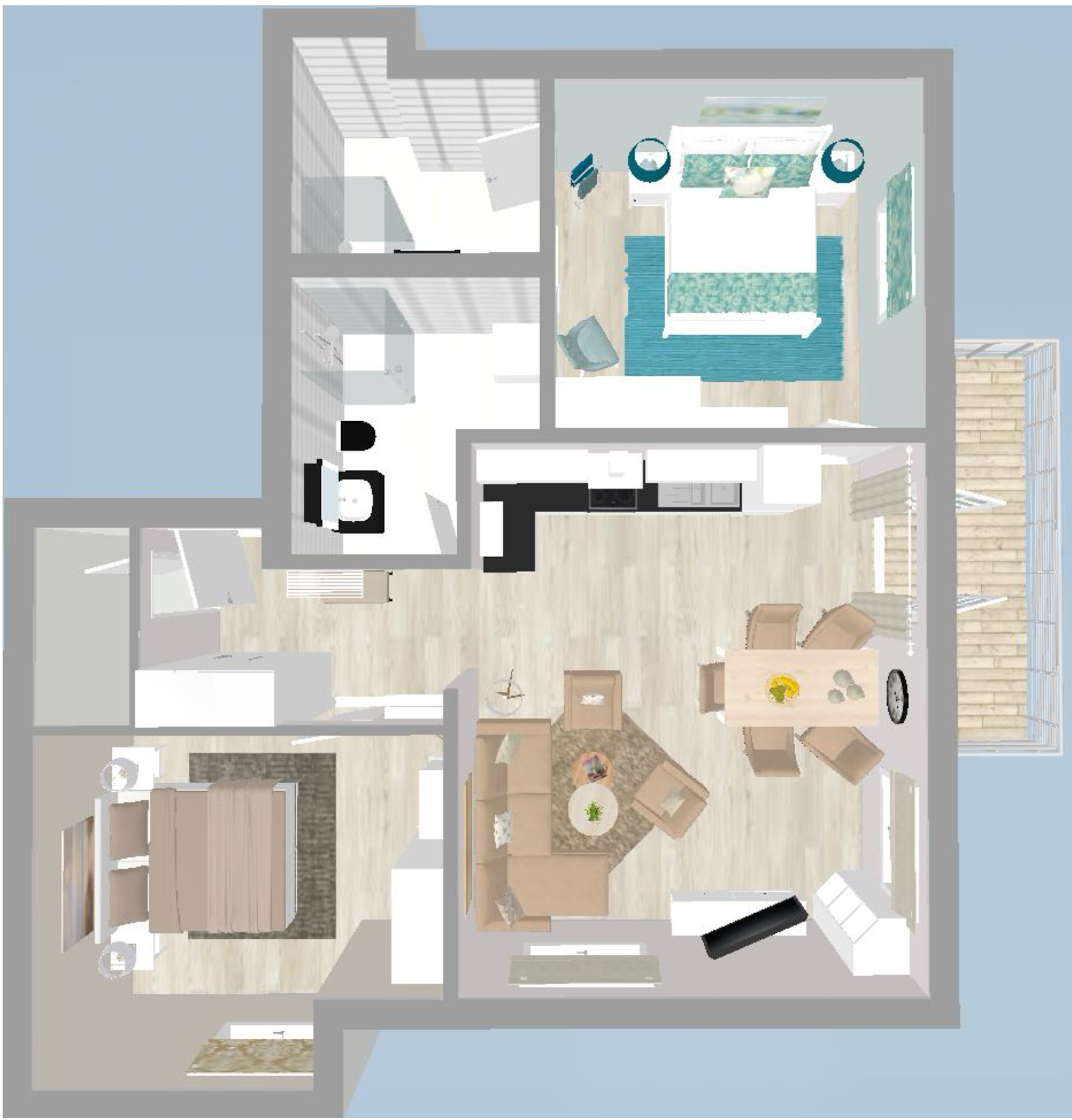Der Wohnbereich der Wohnung besticht durch klare Linien mit maritimen Deko Elementen, hier verbringen sie gemütliche Abende. Auf dem Balkon können Sie den Tag in aller Ruhe mit einem Frühstück in der Sonne beginnen oder entspannt den Abend ausklingen lassen. Zwei voll Bäder mit WC und Dusche runden den hohen Standard ab.