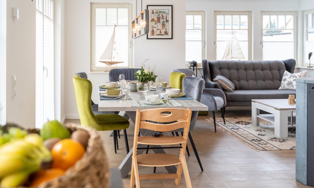 Betreten Sie den Flur des Hauses, von dem aus Sie zunächst das Gäste-WC mit bodengleicher Dusche und dann den großzügigen Küchen-, Ess- und Wohnbereich erreichen. Die Küche ist voll ausgestattet und lässt das Herz eines jeden Hobbykochs höherschlagen. Für die Familie bietet der große Esstisch oder die Sofalandschaft vor Flatscreen-TV und Kamin viel Platz zum Wohlfühlen. Auch von der südwestlich ausgerichteten Terrasse genießen Sie gemütliche Abende.