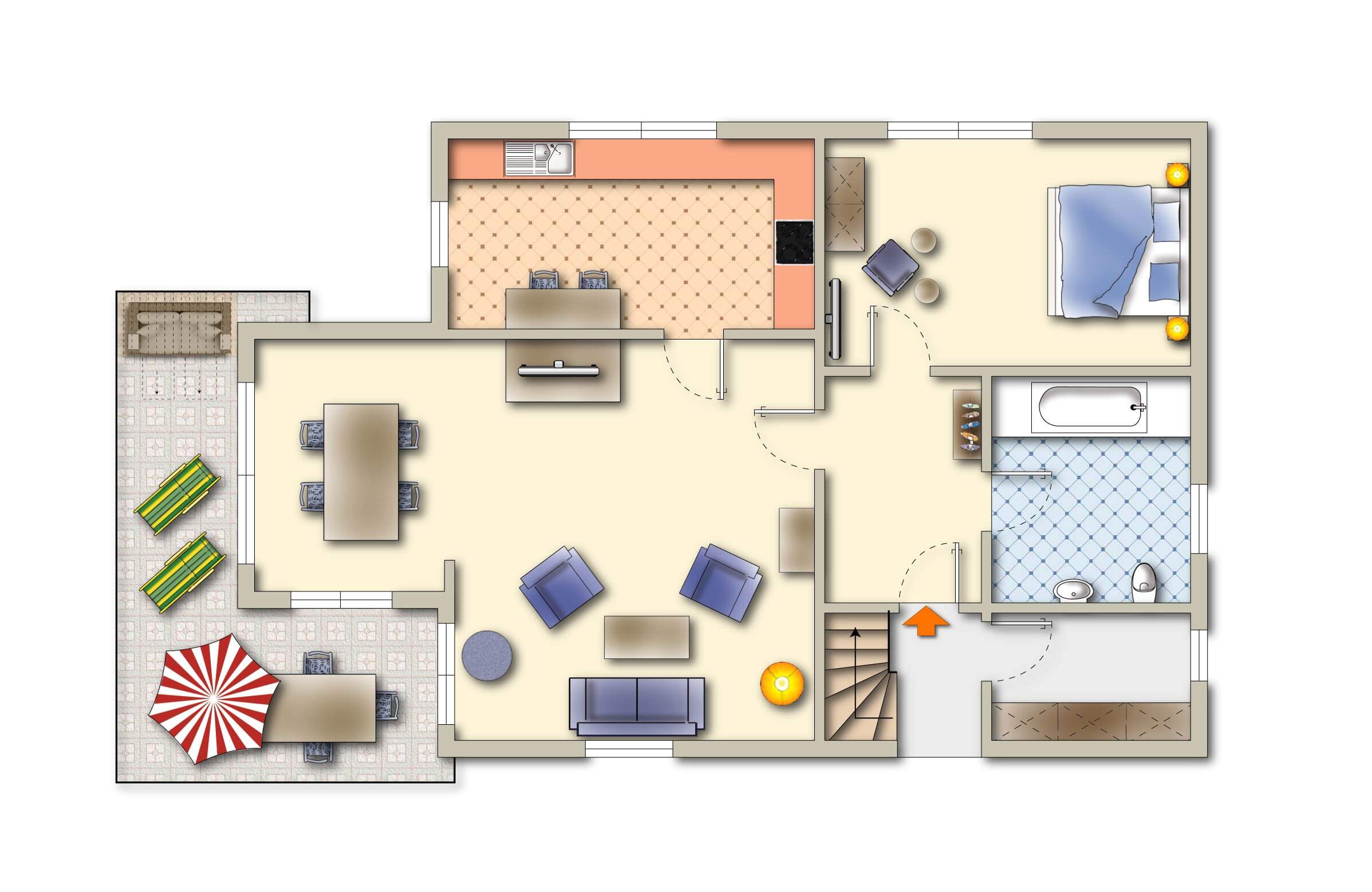 Der lichtdurchflutete Wohnbereich dieses Appartments im Erdgeschoss, umfasst eine urgemütliche Couch mit zwei Sesseln zum Relaxen für gemeinsame gemütliche Abendstunden und einen separaten großen Essbereich. Die angrenzende Küche ist voll ausgestattet und hat einen niedlichen Stehtisch für die erste Konversation am Morgen.