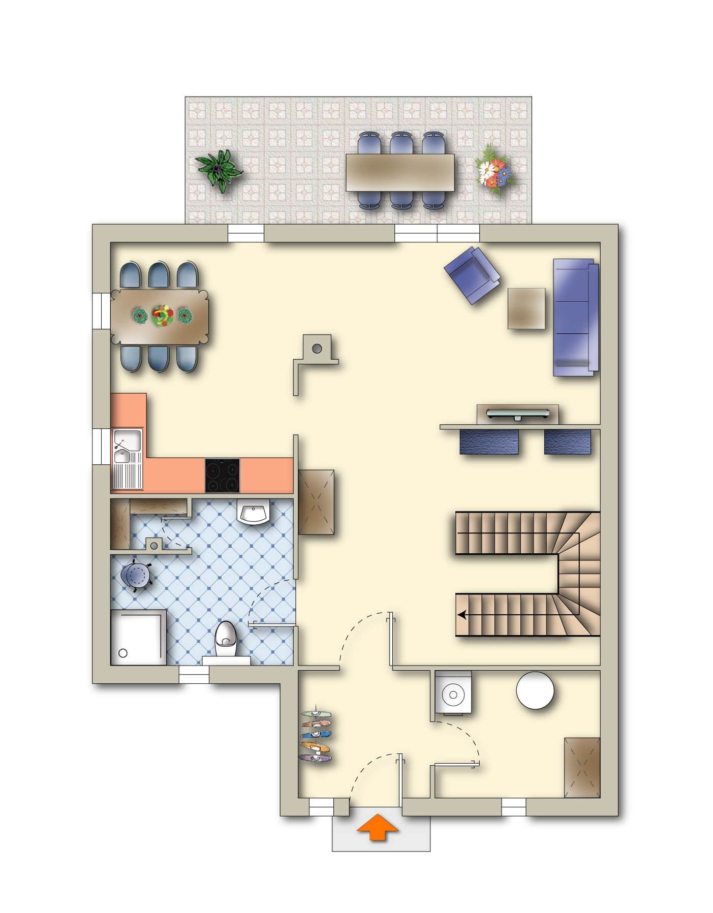 Vom Wohnzimmer gelangen Sie auf die gemütliche, möblierte Terrasse. Weiterhin befindet sich eine Sauna mit angeschlossenem Badezimmer im Erdgeschoss.