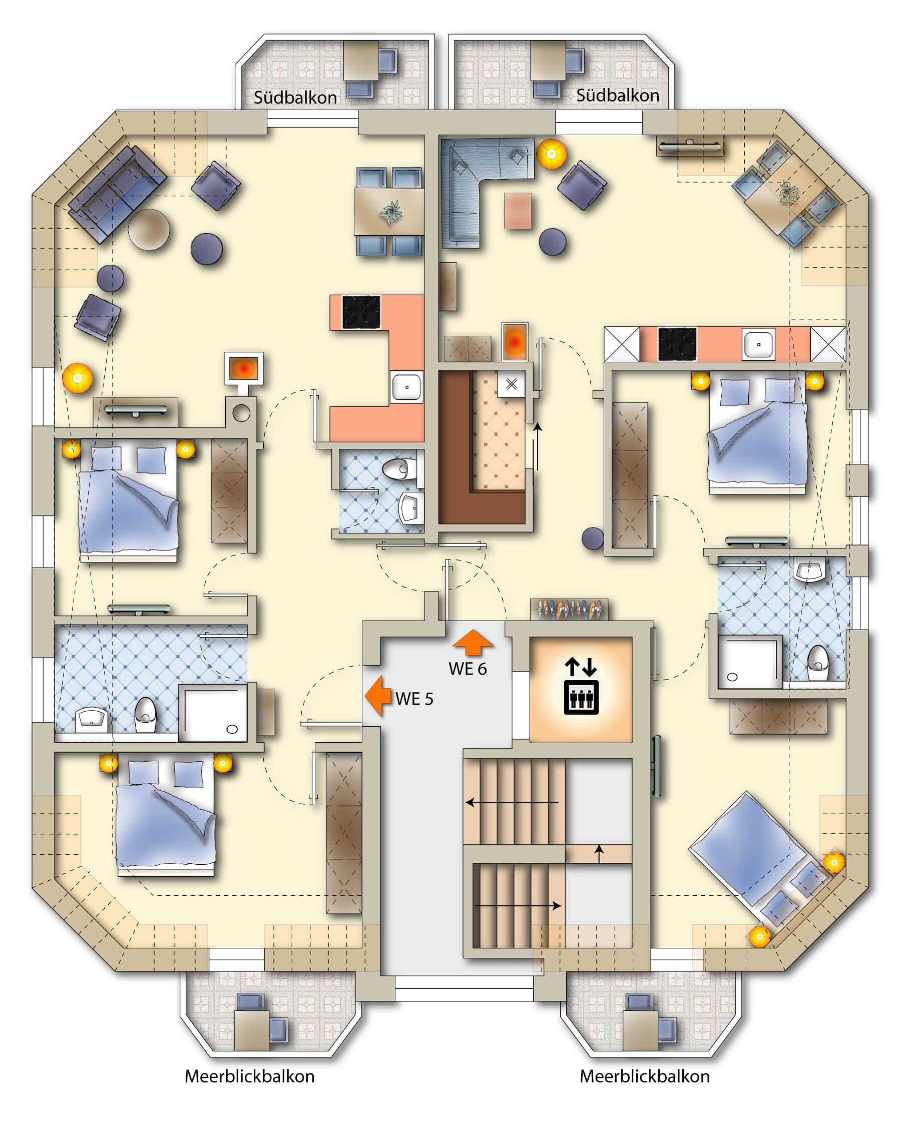 Auf Wunsch besteht die Möglichkeit das Penthouse Knaakje (Grundriss linke Whg.) mit dem direkt angrenzenden Penthouse Kwittje (Grundriss rechte Whg.) im Verbund anzumieten. Die beiden Penthouses bieten dann insgesamt Platz für 8 Personen und können durch eine Verbindungstür miteinander verbunden werden.